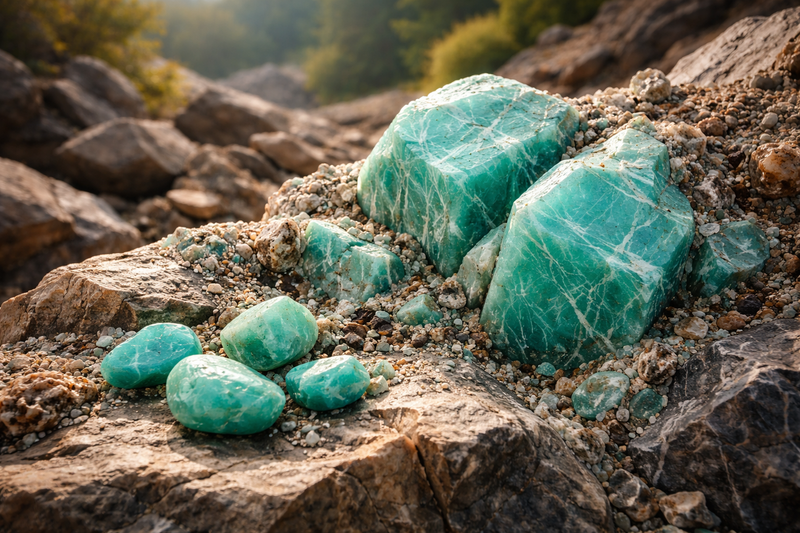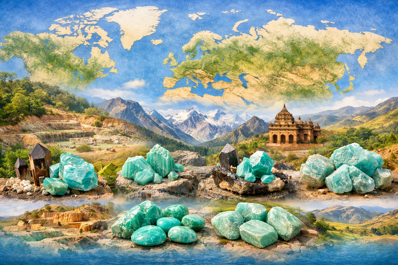 Aujourd’hui, l’amazonite est extraite dans plusieurs régions du monde. Les principaux gisements se situent au Brésil, reconnu pour ses pierres aux couleurs intenses et lumineuses. Madagascar offre également de très belles qualités, souvent très homogènes et vibrantes.