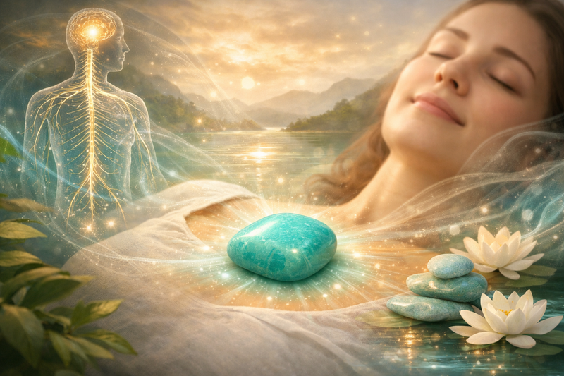Dans une approche énergétique, l’amazonite est souvent associée au système nerveux. Son énergie apaisante contribue à détendre les tensions liées au stress et aux émotions accumulées.