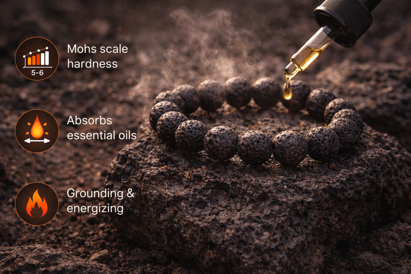 La pierre de lave présente une dureté d’environ 5 à 6 sur l’échelle de Mohs, ce qui la rend adaptée au port quotidien, notamment en bracelet.