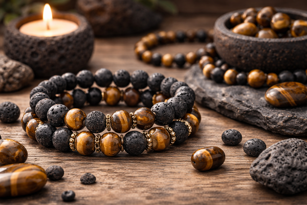 Cette association combine ancrage et confiance en soi. La pierre de lave stabilise et recentre, tandis que l’œil de tigre soutient la force personnelle et la détermination. Ensemble, elles aident à avancer avec solidité et assurance.