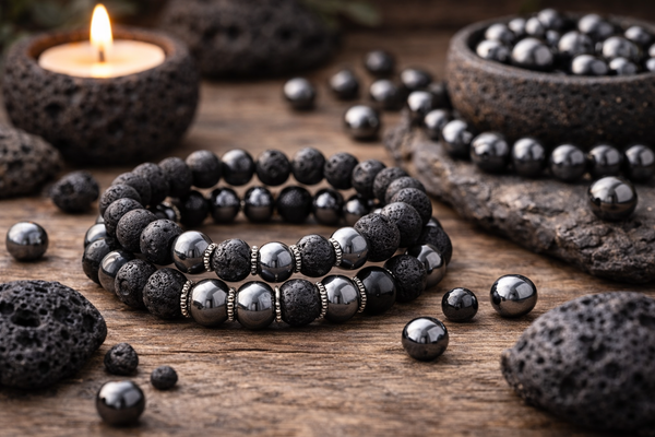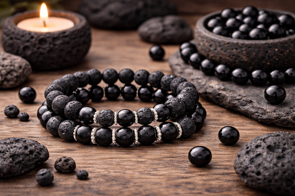 L’onyx apporte une dimension de force et de protection supplémentaire. Associée à la pierre de lave, elle favorise la maîtrise de soi, la résistance face aux épreuves et une meilleure gestion des émotions.