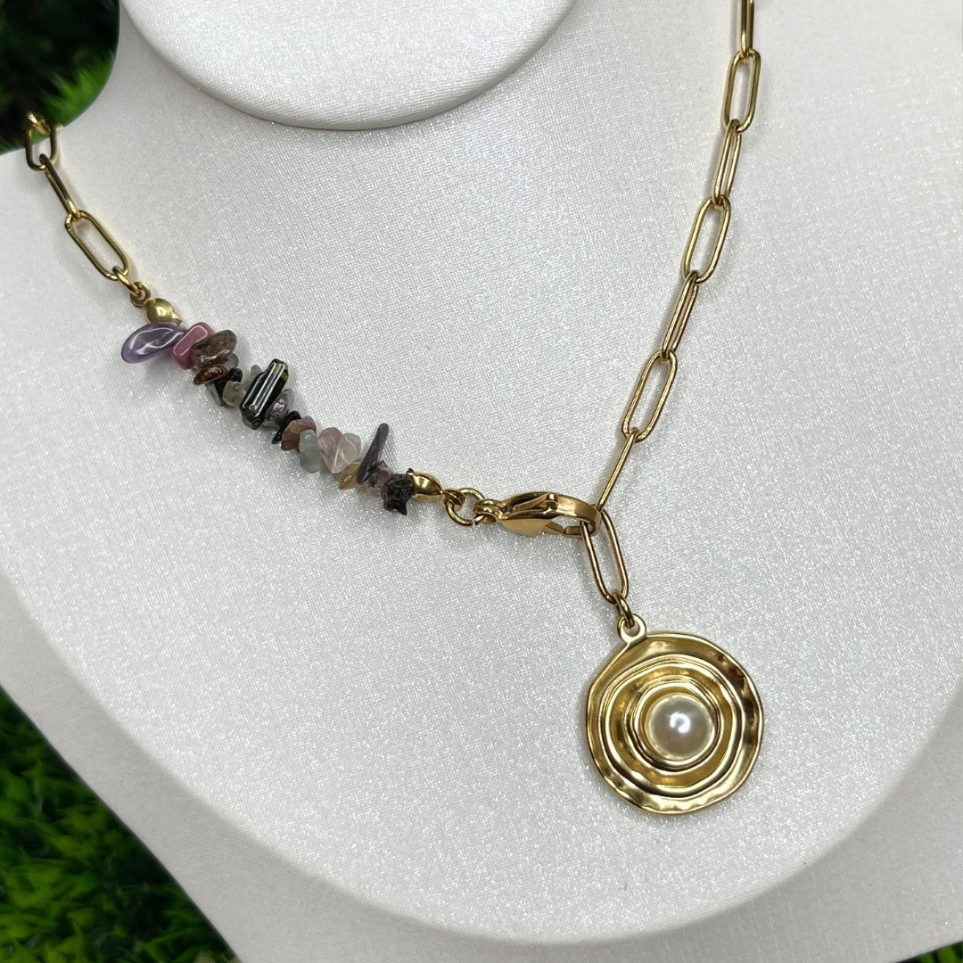 Célébrez l'union de l'élégance et de l'énergie naturelle avec notre Collier Perle Nacre et Perles Chips. Ce bijou raffiné, soigneusement conçu pour notre collection de bijoux lithothérapiques, combine la délicatesse des perles de nacre avec l'authenticité des perles chips. La perle de nacre, symbole de pureté et de grâce, se mêle harmonieusement aux perles chips, offrant une esthétique organique et intemporelle. Portez ce Collier Perle Nacre et Perles Chips pour une touche de sophistication tout en profitant des vibrations énergétiques apaisantes.