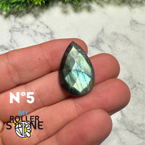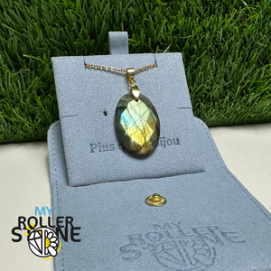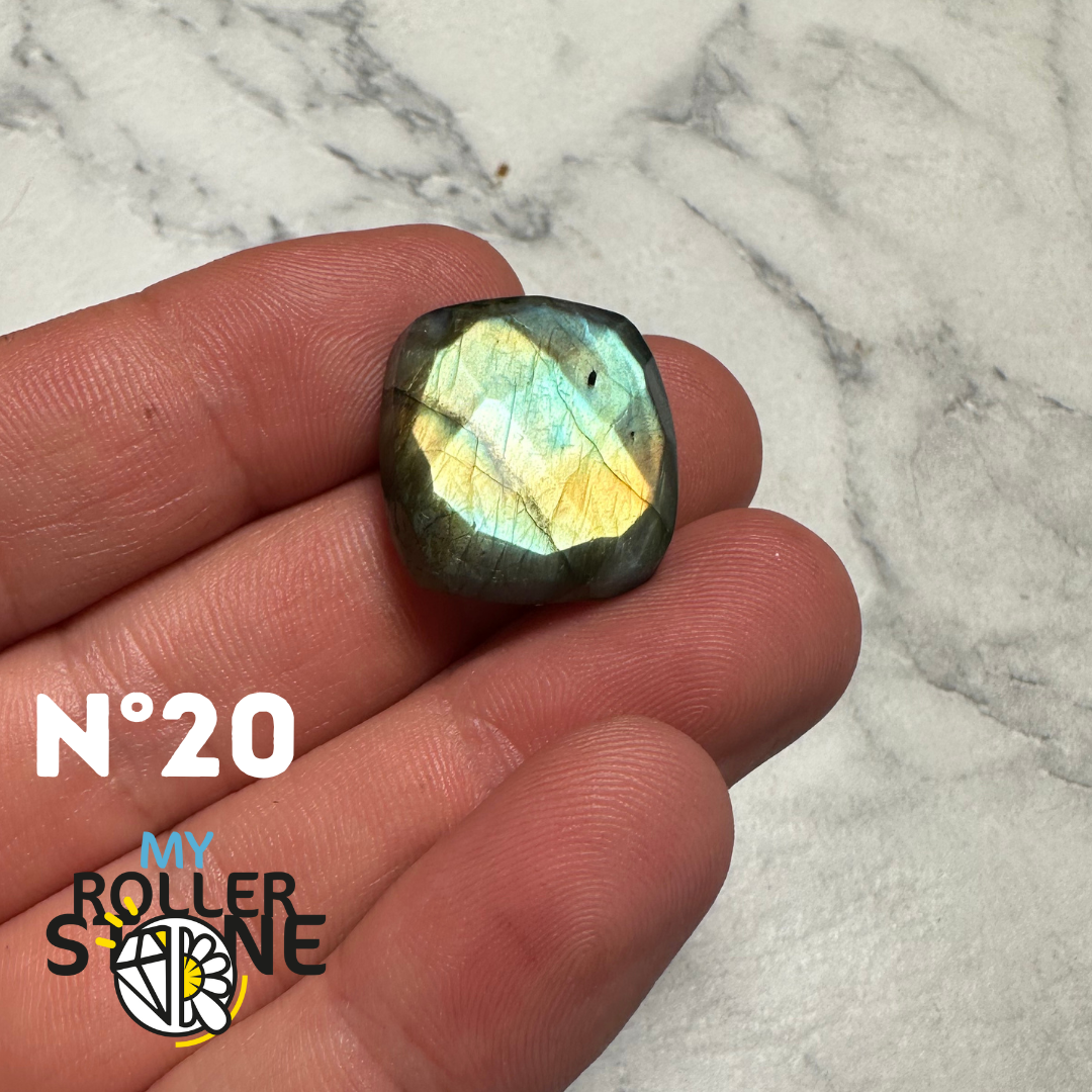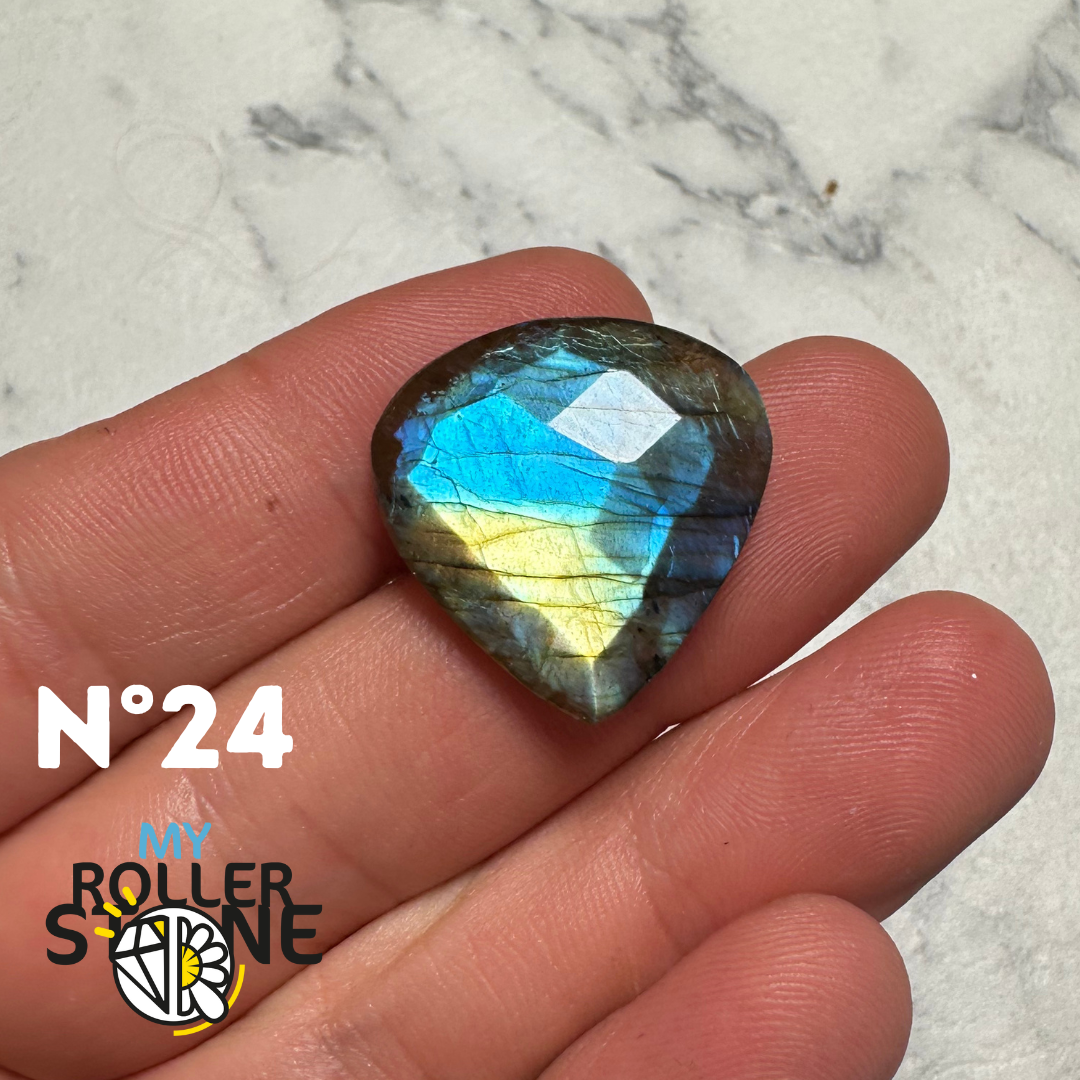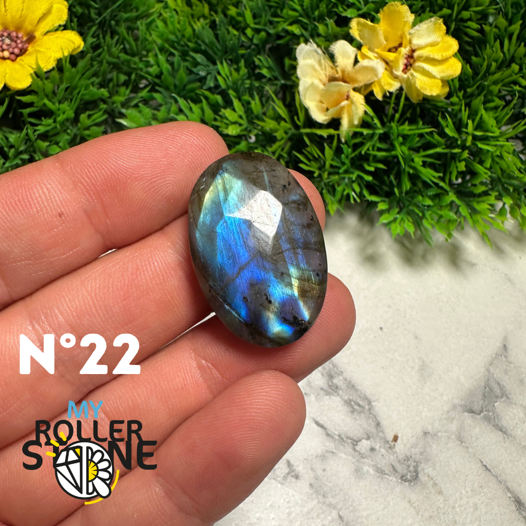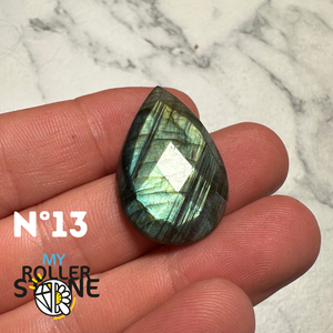 forme libre facettée, une pierre naturelle dont la labradorescence – bleue, verte, dorée ou violette – semble faire danser la lumière sous chaque facette. Véritable œuvre d’art minérale, chaque