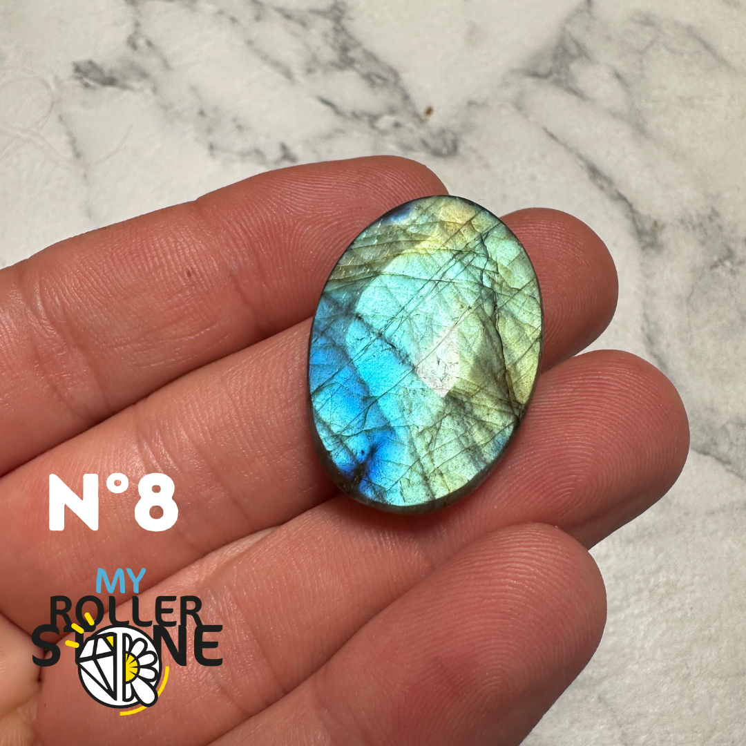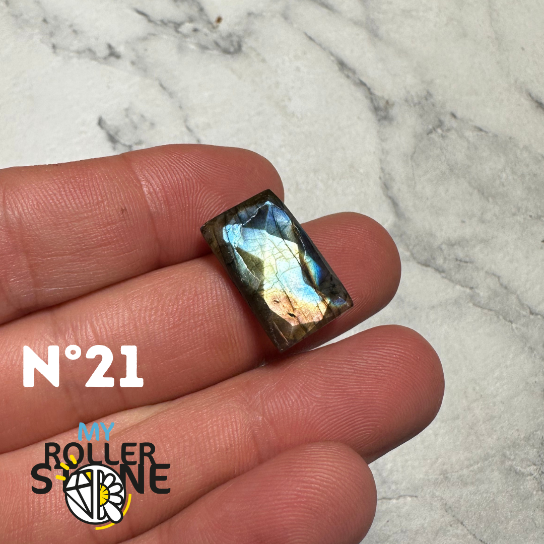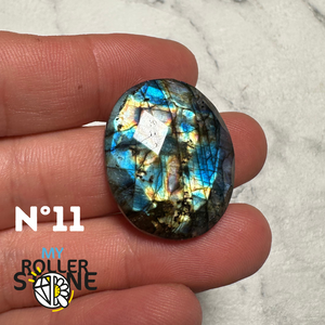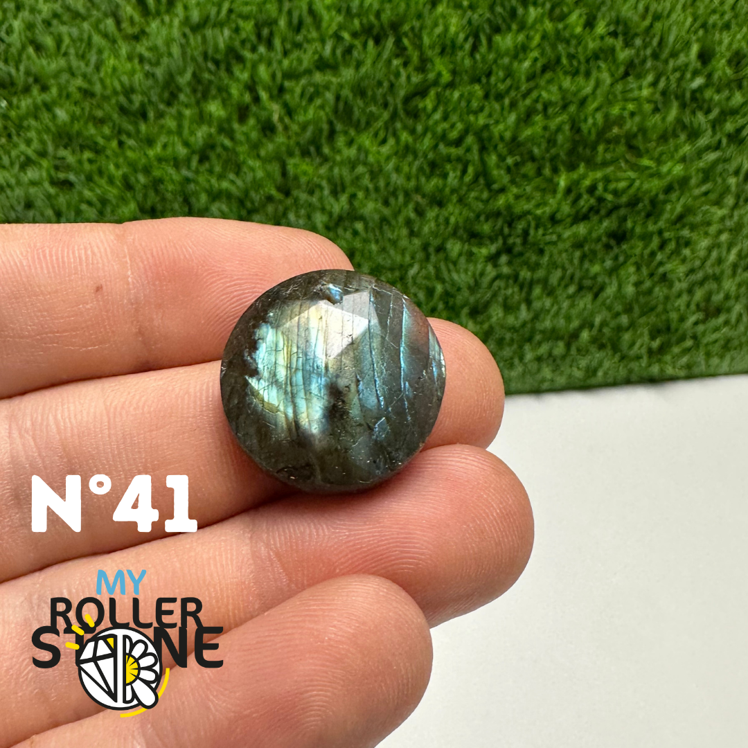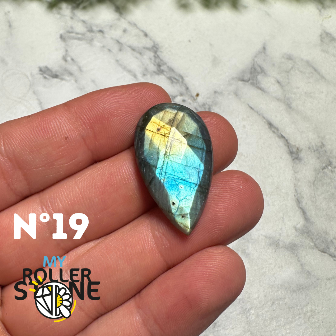 forme libre facettée, une pierre naturelle dont la labradorescence – bleue, verte, dorée ou violette – semble faire danser la lumière sous chaque facette. Véritable œuvre d’art minérale, chaque