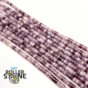 Heishi (disques plats), puis poli pour révéler sa texture soyeuse et ses reflets nacrés. Sa teinte violette pâle, parfois nuancée de blanc ou de rose clair, confère au fil une élégance subtile et spirituelle. C’est une pierre rare, prisée pour sa beauté douce et son énergie équilibrante.