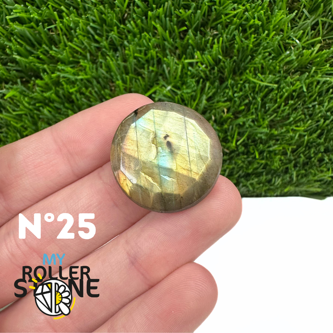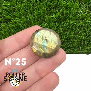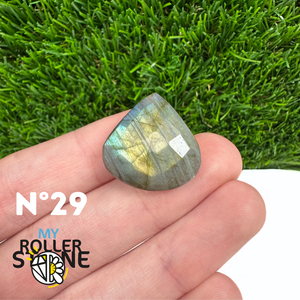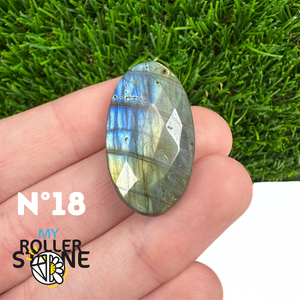 Canada, deux gisements réputés pour la qualité de leurs reflets et la densité de la pierre. Le travail en cabochon facetté met en valeur la structure interne de la labradorite tout en offrant une surface nette et lumineuse, idéale pour la création de bijoux haut de gamme.