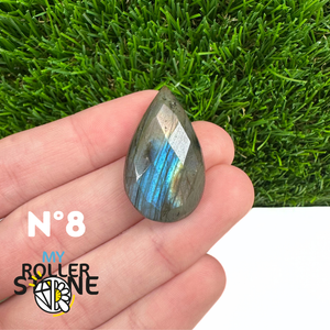 labradorescence intense et profonde, révélant des reflets bleus, verts, parfois dorés selon l’orientation de la lumière. La taille facettée apporte relief et éclat supplémentaires, tout en conservant l’aspect naturel et puissant de la pierre. Chaque pièce est unique par ses jeux de lumière et sa forme.