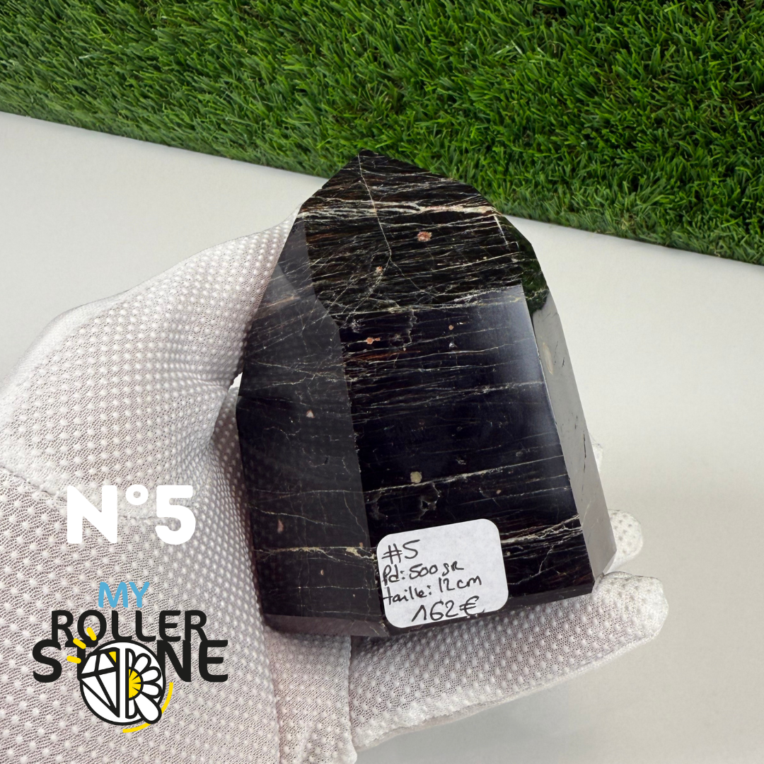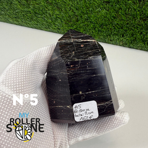 La forme en pointe concentre et dirige le flux énergétique. Sa base capte les énergies telluriques tandis que sa pointe les oriente vers le haut, créant une circulation fluide et équilibrée. En Tourmaline Noire, cette structure renforce la capacité de la pierre à absorber, transmuter et stabiliser les vibrations environnantes.