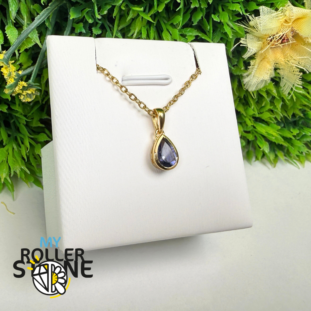 Ce pendentif en Iolite naturelle monté en plaqué or 18K dévoile de profondes nuances bleu-violet aux reflets subtils. Élégamment sertie, cette pierre offre un bijou raffiné, à la fois lumineux et sophistiqué, idéal pour des créations haut de gamme.