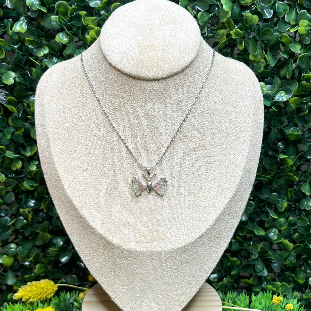 Découvrez notre Pendentif Papillon Tourmaline Watermelon. Cette pierre naturelle aux tons roses et verts évoque la fraîcheur d'une pastèque. Chaque pierre est unique, présentant des variations de couleur et une authenticité remarquable.