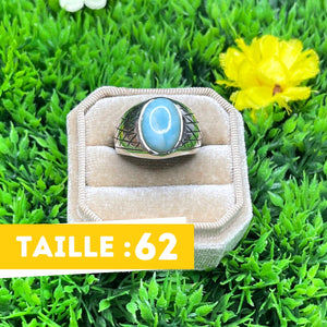 La monture en argent sterling 925 assure une finition de grande qualité, mettant en valeur la teinte bleu ciel unique du Larimar, souvent traversée de motifs nuageux qui rappellent le ciel et la mer des Caraïbes. Disponible dans différentes tailles de bague, cette chevalière offre un ajustement parfait pour un port confortable.