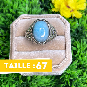 La monture en argent sterling 925 assure une finition de grande qualité, mettant en valeur la teinte bleu ciel unique du Larimar, souvent traversée de motifs nuageux qui rappellent le ciel et la mer des Caraïbes. Disponible dans différentes tailles de bague, cette chevalière offre un ajustement parfait pour un port confortable.