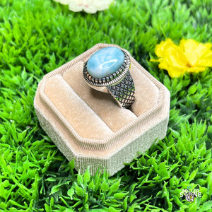 Larimar, souvent traversée de motifs nuageux qui rappellent le ciel et la mer des Caraïbes. Disponible dans différentes tailles de bague, cette chevalière offre un ajustement parfait pour un port confortable.