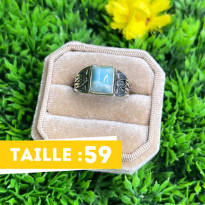 La monture en argent sterling 925 assure une finition de grande qualité, mettant en valeur la teinte bleu ciel unique du Larimar, souvent traversée de motifs nuageux qui rappellent le ciel et la mer des Caraïbes. Disponible dans différentes tailles de bague, cette chevalière offre un ajustement parfait pour un port confortable.