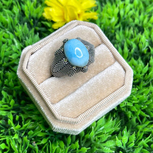 La monture en argent sterling 925 assure une finition de grande qualité, mettant en valeur la teinte bleu ciel unique du Larimar, souvent traversée de motifs nuageux qui rappellent le ciel et la mer des Caraïbes. Disponible dans différentes tailles de bague, cette chevalière offre un ajustement parfait pour un port confortable.
