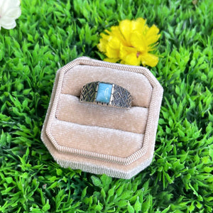 La monture en argent sterling 925 assure une finition de grande qualité, mettant en valeur la teinte bleu ciel unique du Larimar, souvent traversée de motifs nuageux qui rappellent le ciel et la mer des Caraïbes. Disponible dans différentes tailles de bague, cette chevalière offre un ajustement parfait pour un port confortable.