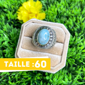 La monture en argent sterling 925 assure une finition de grande qualité, mettant en valeur la teinte bleu ciel unique du Larimar, souvent traversée de motifs nuageux qui rappellent le ciel et la mer des Caraïbes. Disponible dans différentes tailles de bague, cette chevalière offre un ajustement parfait pour un port confortable.