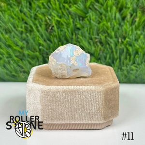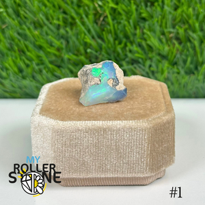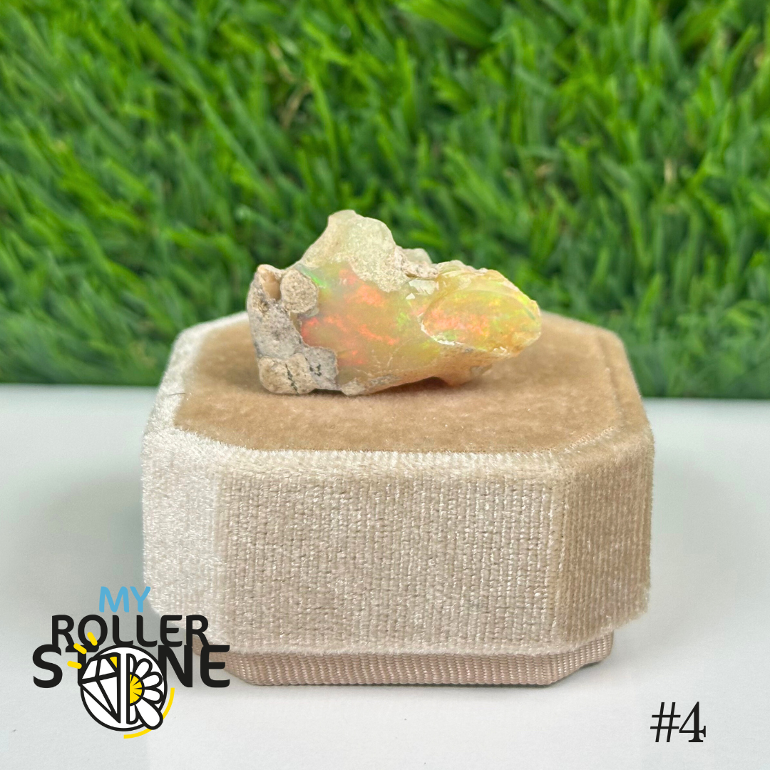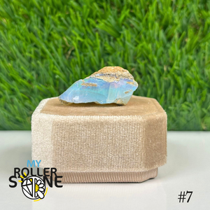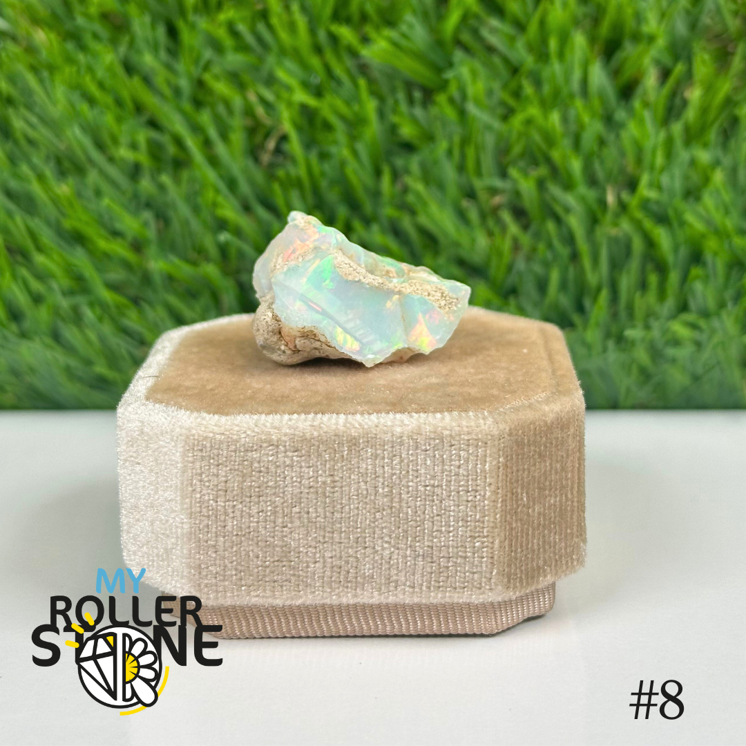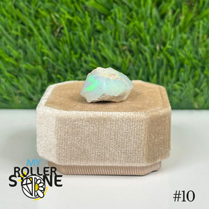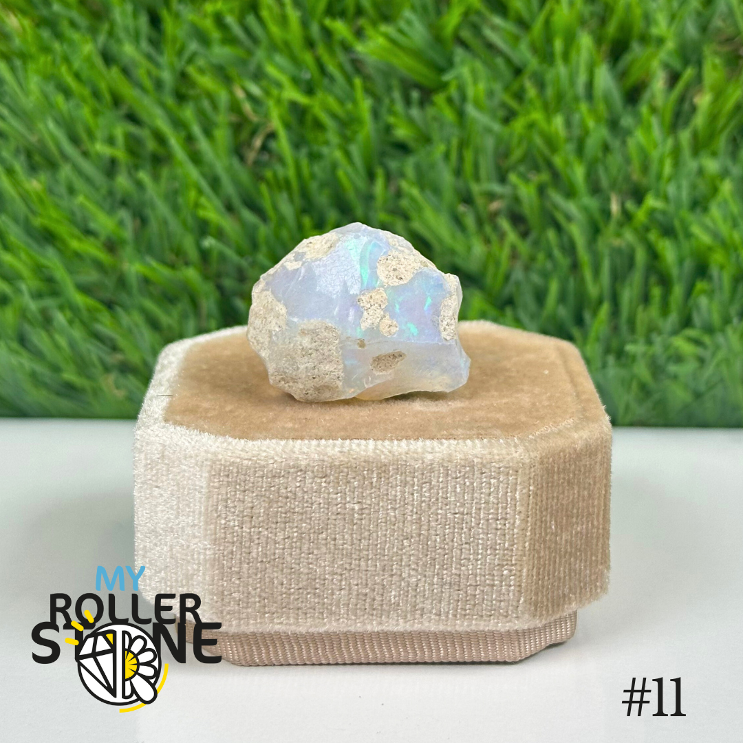 L’opale brute d’Éthiopie présente une base laiteuse, parfois translucide, parsemée de feux irisés aux reflets multicolores (vert, bleu, rouge, orange) selon l’angle de la lumière. Sa surface irrégulière et ses éclats internes en font un joyau naturel brut et fascinant.