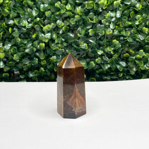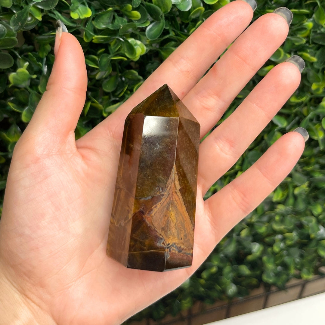 Chaque Pointe Pierre Oeil de tigre est unique, avec ses propres motifs et variations de couleurs allant du brun doré au jaune chatoyant. La taille et la forme de la pointe est idéale comme pierre centrale dans les grilles de cristal pour la vitalité, la richesse ou l'enracinement, car elle recueille l'énergie des autres cristaux et la concentre vers votre objectif.