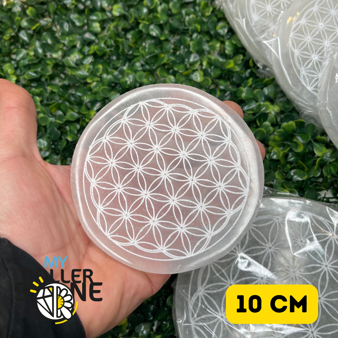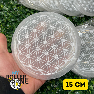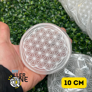 Cette plaque en sélénite, gravée du motif Fleur de Vie, est un support polyvalent idéal pour :