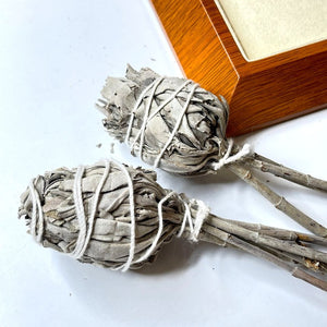 La sauge blanche en torche est fabriquée en attachant des feuilles de sauge blanche ensemble pour former une torche. Cette torche est ensuite allumée, laissant la fumée de la sauge se répandre dans l'air. La fumée de la sauge blanche est censée purifier l'air des énergies négatives, des esprits malveillants et des émotions toxiques.