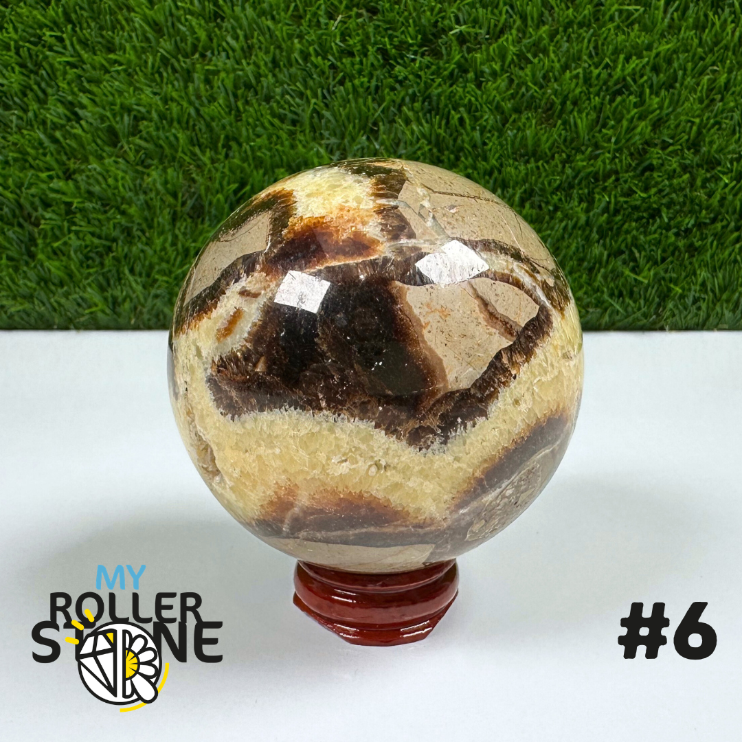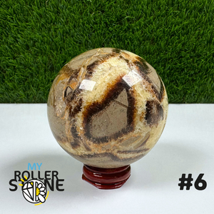 La sphère en Septaria est une pierre naturelle fascinante reconnaissable à ses motifs géométriques uniques mêlant teintes brunes, jaunes et beiges. Chaque sphère présente des fissures naturelles remplies de calcite qui créent des dessins organiques remarquables.