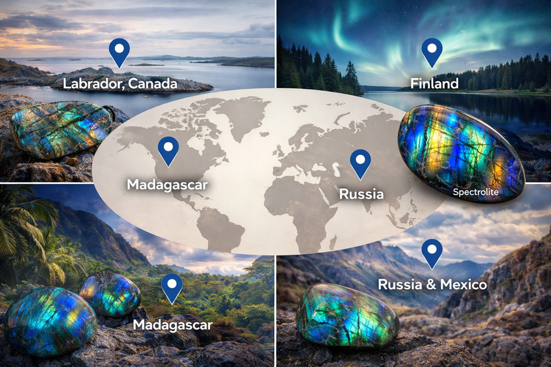 La provenance influence la qualité et le prix. Madagascar est réputé pour ses reflets très marqués, tandis que la Finlande propose la spectrolite, une variété aux couleurs particulièrement intenses.