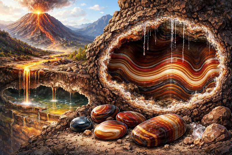 Comme la plupart des quartz, la sardonyx est composée principalement de dioxyde de silicium (SiO₂). Elle se forme lentement dans des cavités de roches volcaniques, où des dépôts successifs de silice cristallisent au fil du temps. Ce processus géologique peut durer des milliers, voire des millions d’années, permettant la formation des couches caractéristiques visibles à l’intérieur de la pierre.