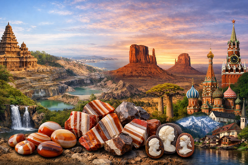 Parmi ces régions, l’Inde est l’un des principaux producteurs de sardonyx. Les pierres provenant de ce pays sont souvent réputées pour leurs bandes très distinctes et leurs contrastes marqués, caractéristiques particulièrement recherchées dans la fabrication de bijoux.