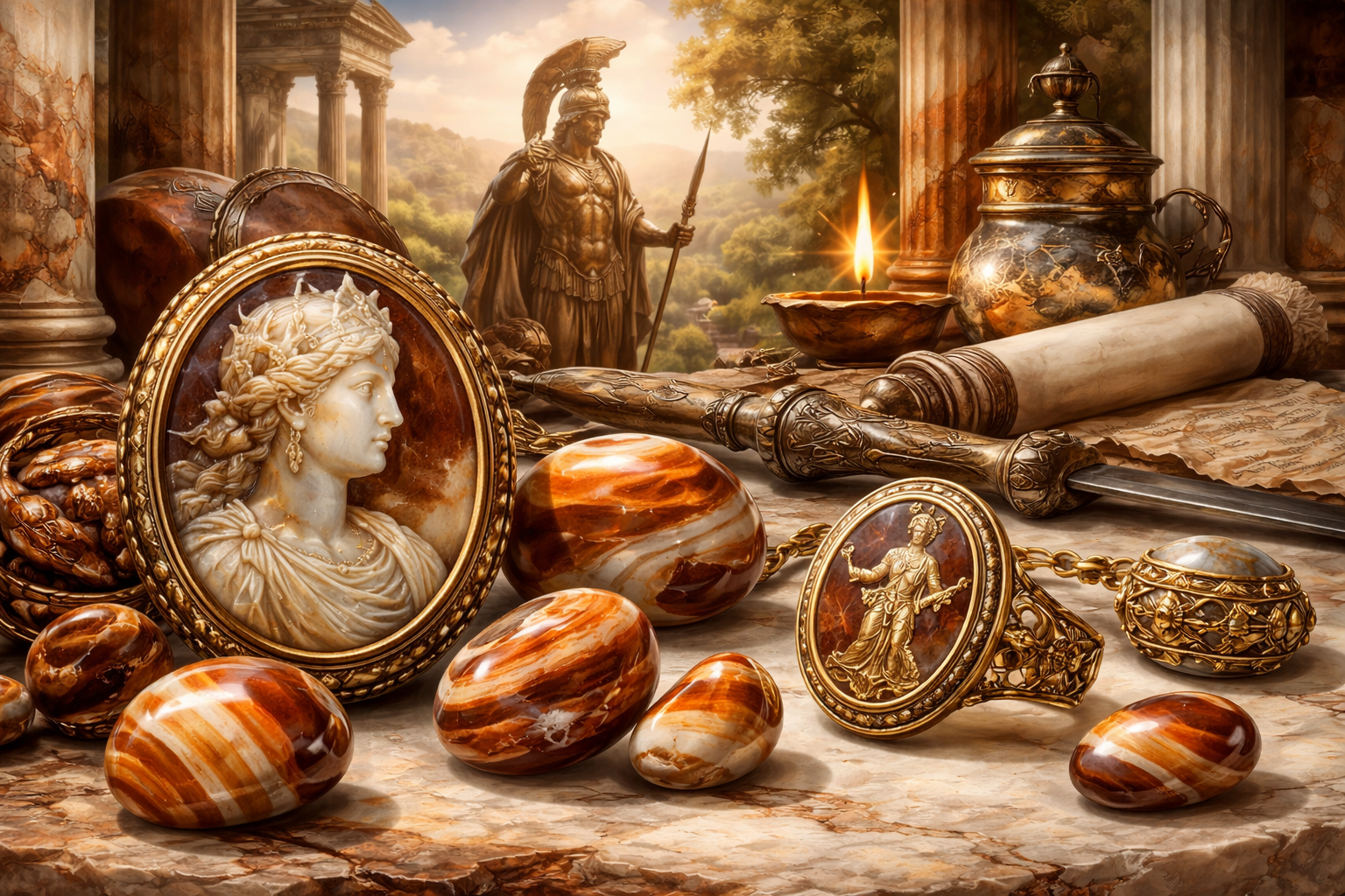 Grâce à sa structure en couches, la sardonyx était idéale pour la gravure de camées et de sceaux. Les artisans utilisaient les différentes strates de couleur pour créer des reliefs très détaillés, faisant apparaître des portraits, des symboles ou des scènes mythologiques. Ces objets étaient souvent portés en bijoux ou utilisés comme sceaux personnels pour signer des documents importants.