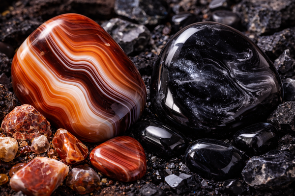 La combinaison de la sardonyx et de l’obsidienne crée une alliance orientée vers la protection énergétique et la stabilité. L’obsidienne est connue pour son énergie protectrice et sa capacité à aider à faire face aux blocages émotionnels. Associée à la sardonyx, elle favorise un sentiment de sécurité et de solidité intérieure.