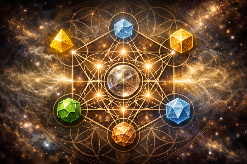 On y retrouve notamment les solides de Platon, qui sont considérés comme les bases géométriques de la matière. Ce symbole est souvent perçu comme une représentation de l’ordre caché de l’univers et des structures invisibles qui le composent.