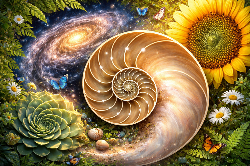 On peut observer cette spirale dans les coquillages, les tournesols ou encore certaines formations galactiques. Elle symbolise l’évolution, le mouvement et la dynamique de la vie.