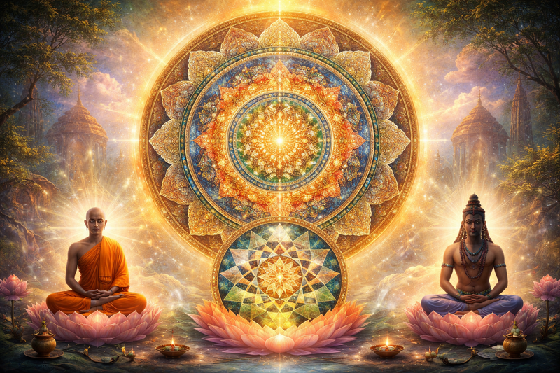 Dans les traditions bouddhistes et hindoues, la géométrie sacrée occupe une place centrale à travers les mandalas et les yantras. Ces formes géométriques sont utilisées comme supports de méditation et de concentration.