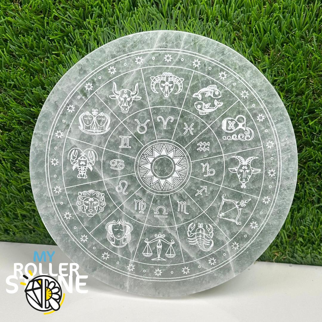 La Sélénite provient du Maroc. Elle est taillée et polie pour révéler sa structure fibreuse lumineuse. Gravé de symboles astrologiques et ésotériques, le cadran astral associe la douceur lunaire de la pierre à un design sacré et harmonieux.