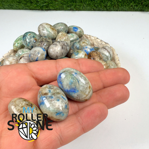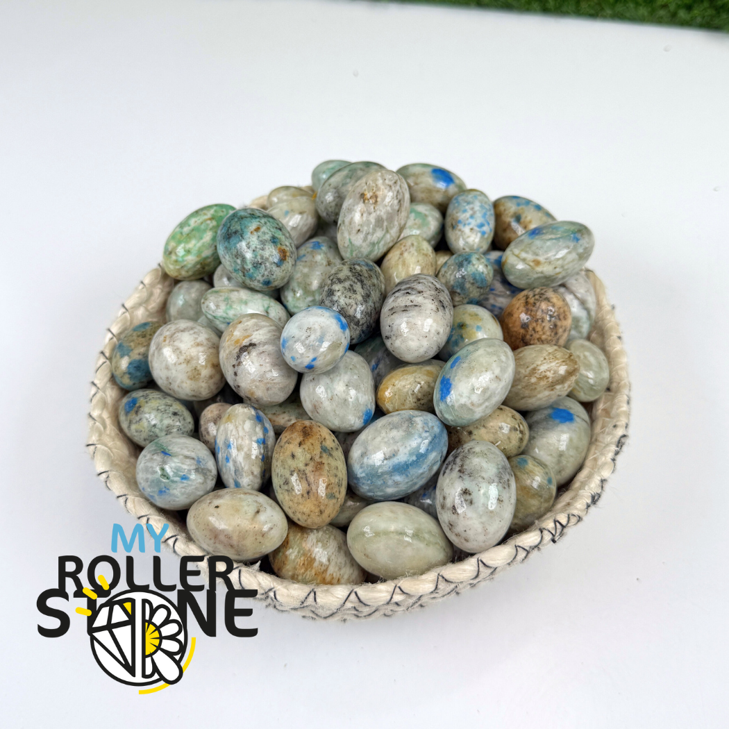 La pierre K2 est issue des contreforts du mont K2, dans la chaîne de l’Himalaya. Elle résulte de l’association naturelle du granite et de l’azurite, formant une pierre rare et reconnaissable. Le roulage met en valeur le contraste entre le fond clair et les ponctuations bleues, tout en adoucissant les contours.