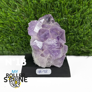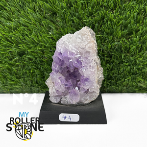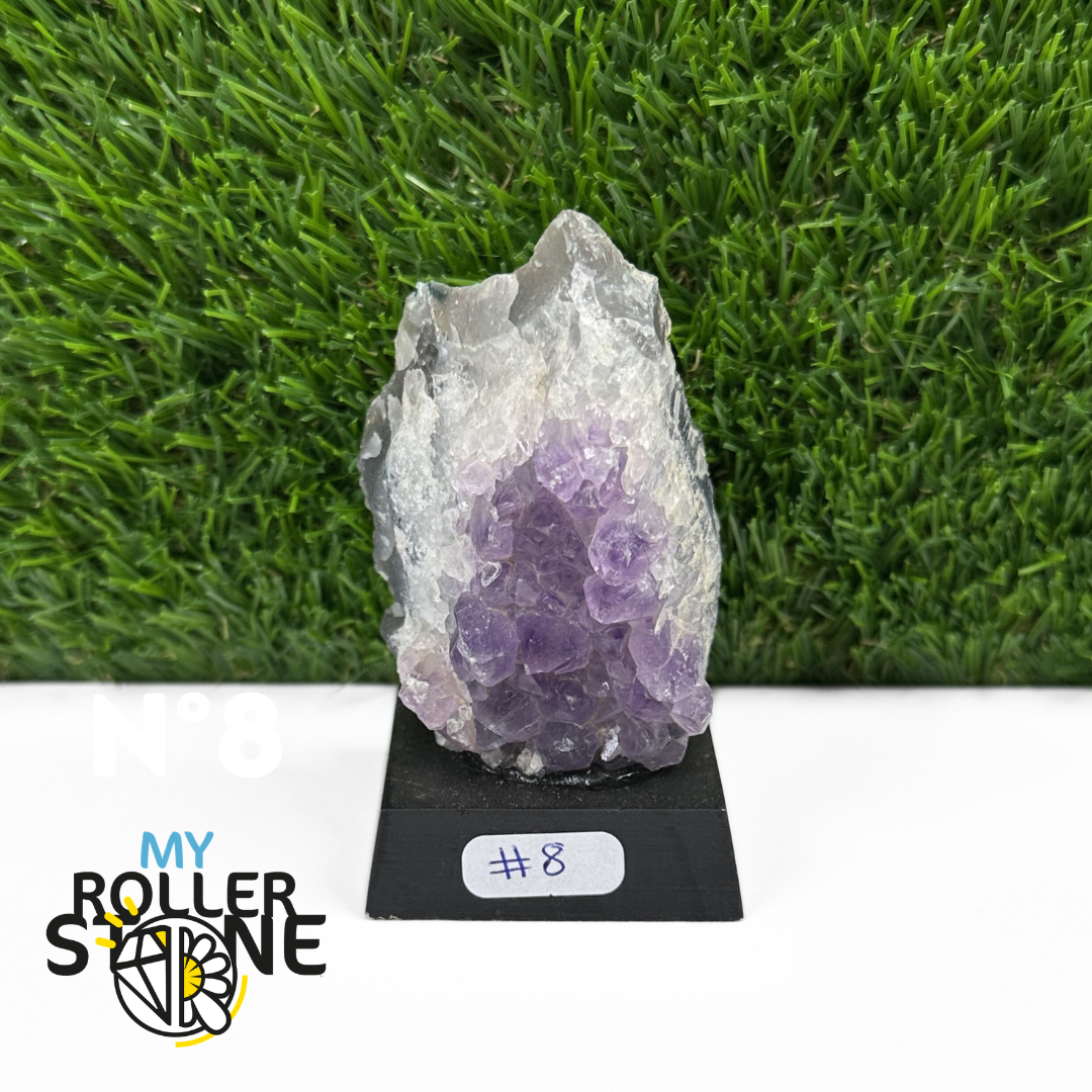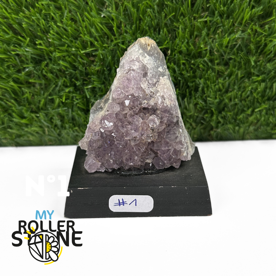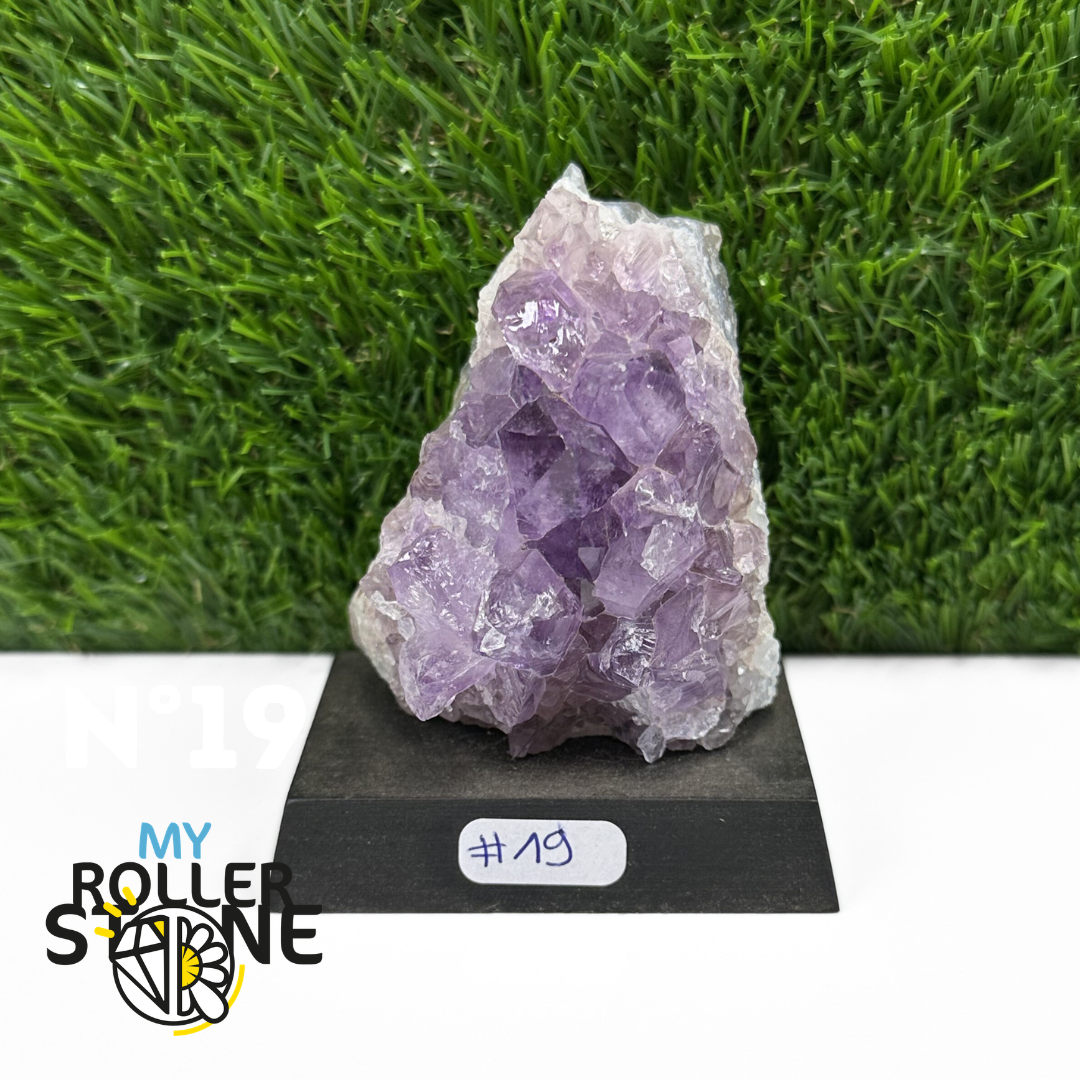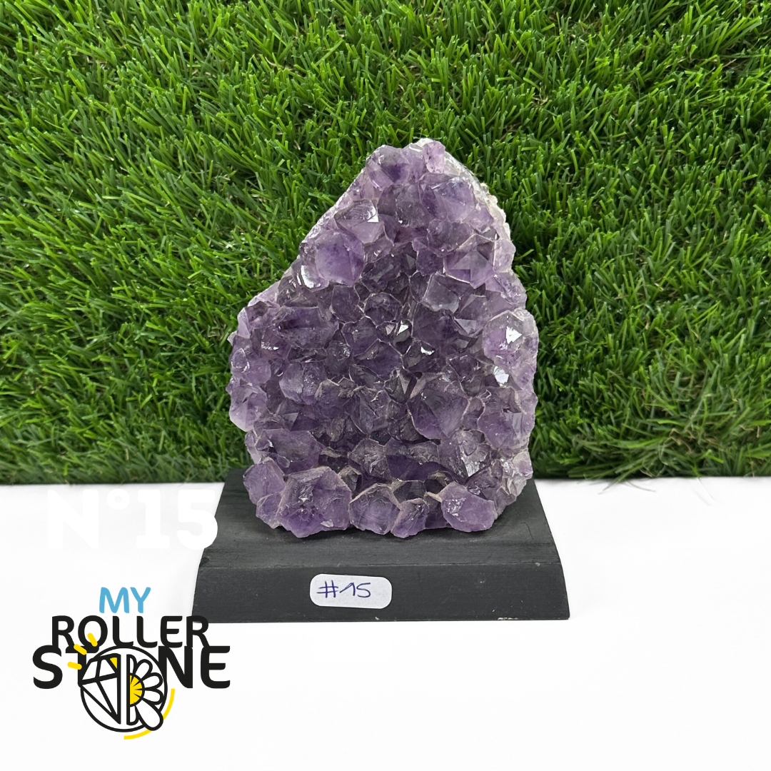 Originaire du Brésil, région mondialement reconnue pour la qualité exceptionnelle de ses gisements d’Améthyste, cette pierre naturelle révèle des cristaux lumineux et une teinte violette pure. Chaque pièce est façonnée et positionnée avec soin sur un présentoir en bois noir mat qui met en valeur ses reflets et sa profondeur.