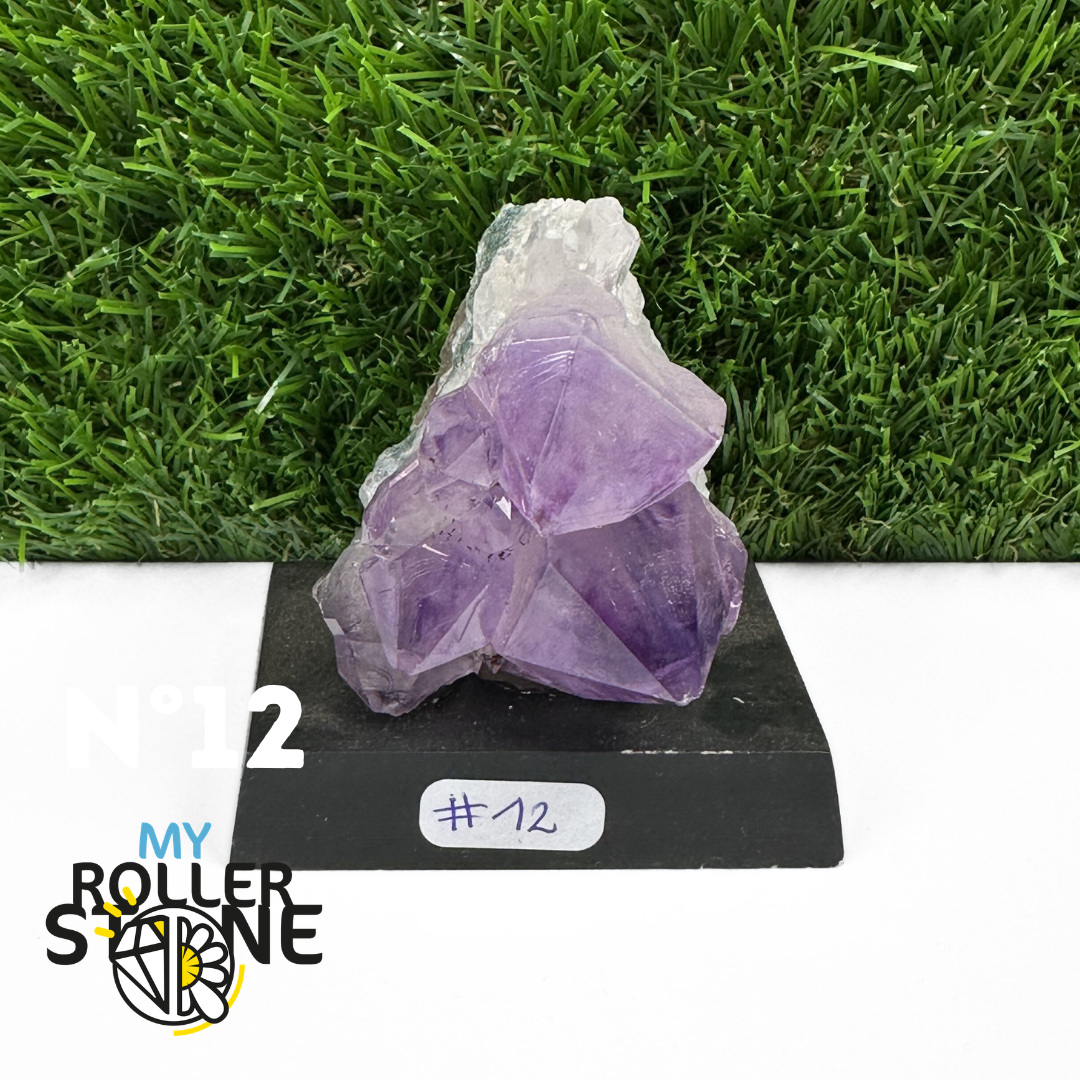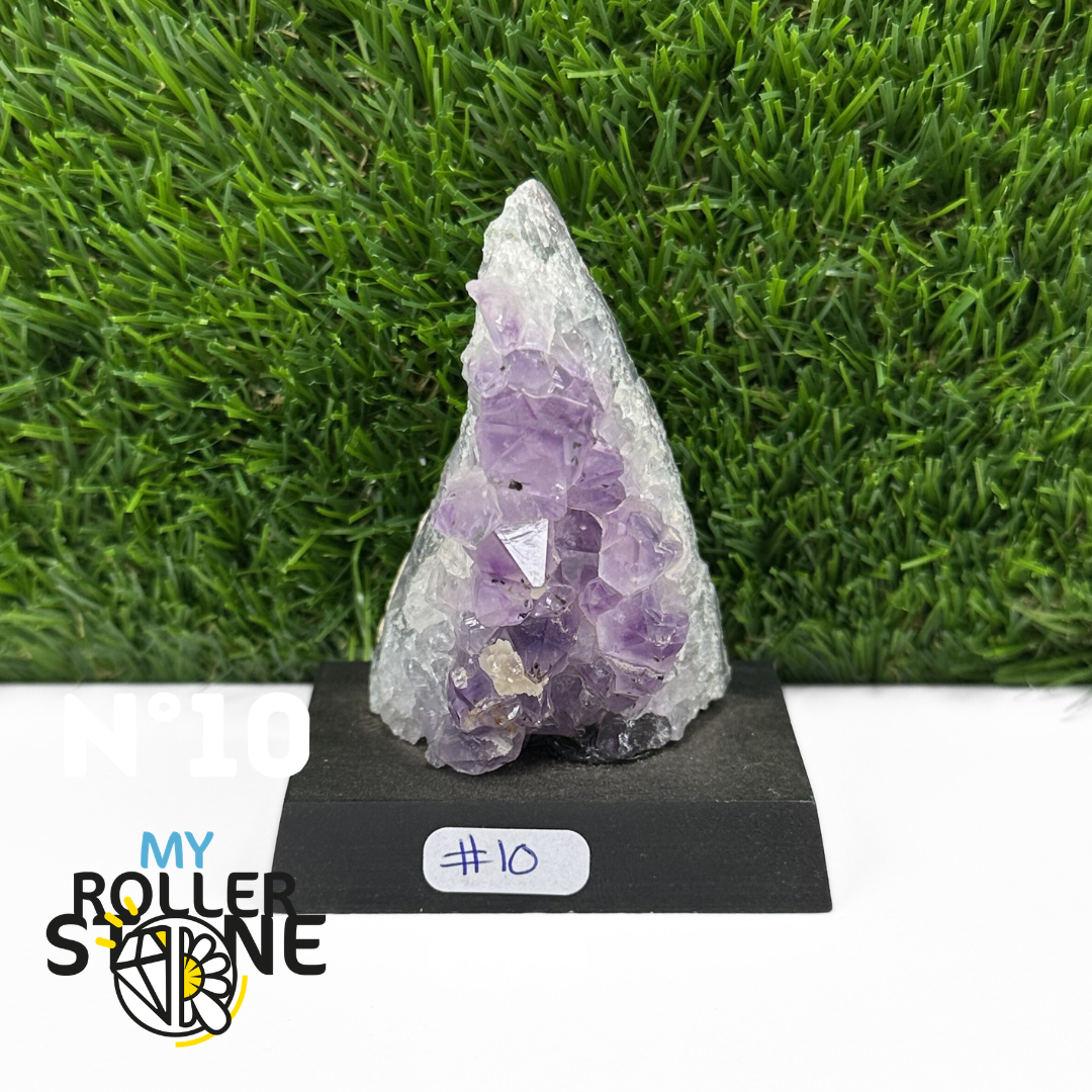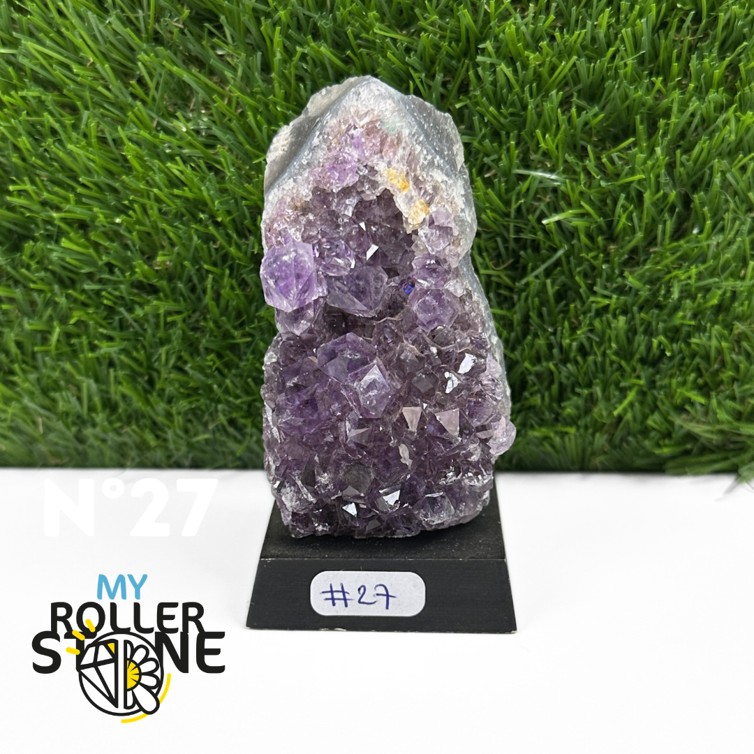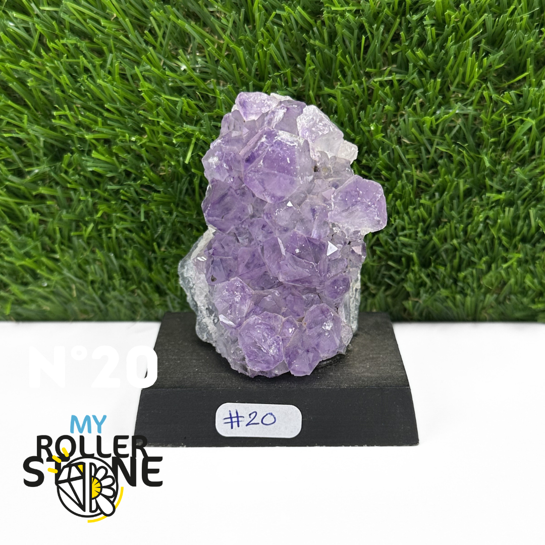 Originaire du Brésil, région mondialement reconnue pour la qualité exceptionnelle de ses gisements d’Améthyste, cette pierre naturelle révèle des cristaux lumineux et une teinte violette pure. Chaque pièce est façonnée et positionnée avec soin sur un présentoir en bois noir mat qui met en valeur ses reflets et sa profondeur.