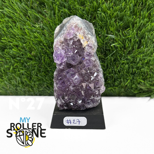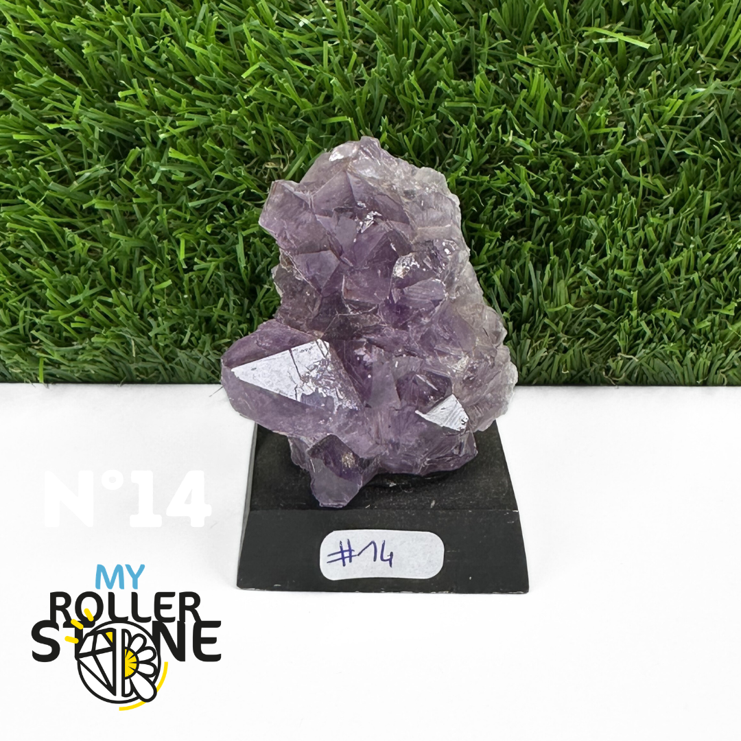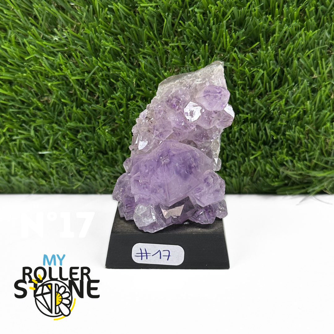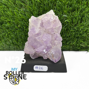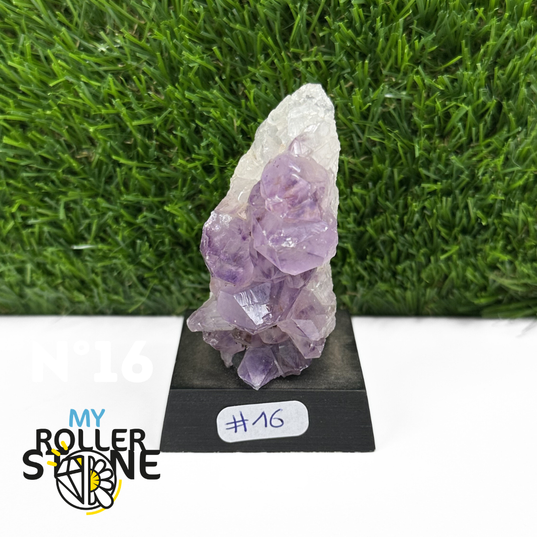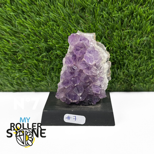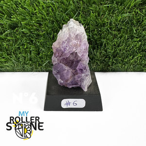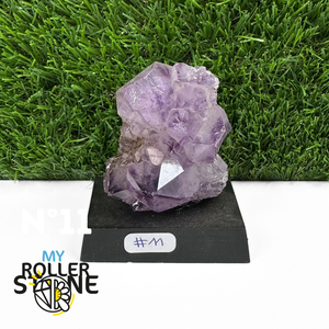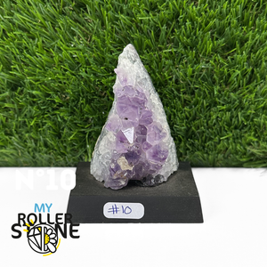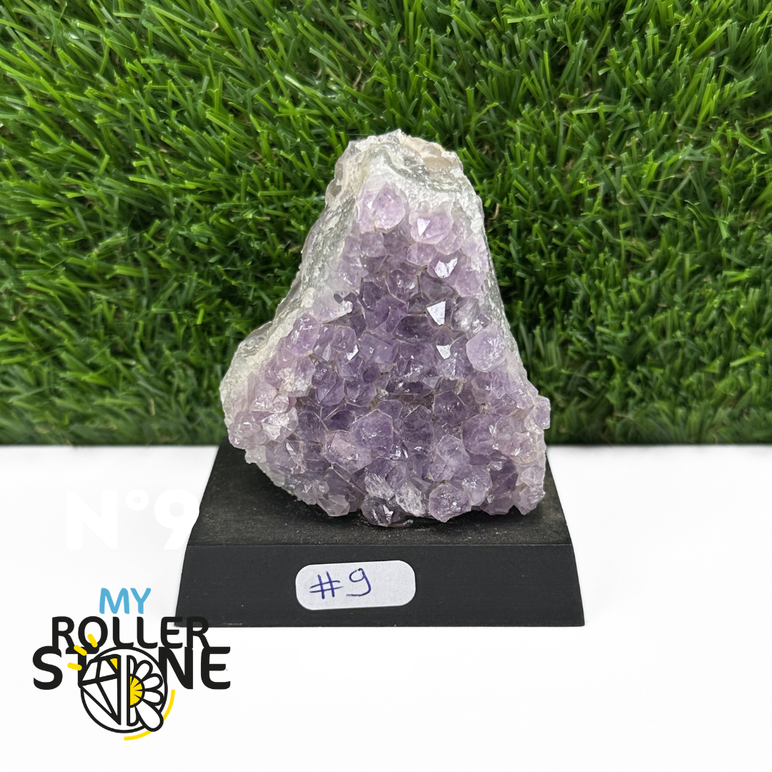 Originaire du Brésil, région mondialement reconnue pour la qualité exceptionnelle de ses gisements d’Améthyste, cette pierre naturelle révèle des cristaux lumineux et une teinte violette pure. Chaque pièce est façonnée et positionnée avec soin sur un présentoir en bois noir mat qui met en valeur ses reflets et sa profondeur.