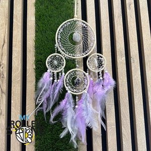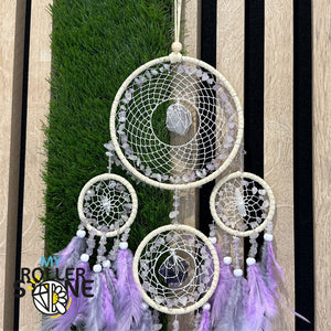 Cet attrape-rêve en Améthyste et Cristal de Roche allie profondeur spirituelle et pureté minérale. Ses nuances violettes et gris clair créent une atmosphère apaisante, idéale pour un espace de repos ou de méditation.