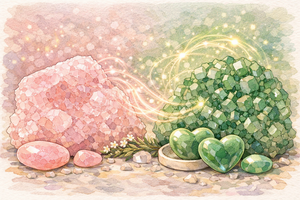 L’aventurine verte apporte une énergie de renouveau et de régénération, tandis que le quartz rose ouvre le cœur en douceur.