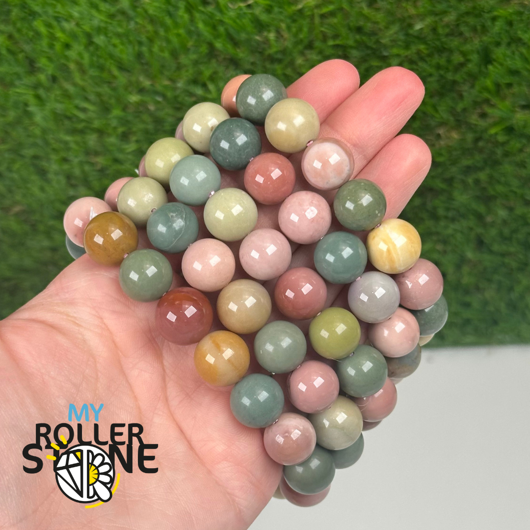 Ce bracelet en Pierre d’Alxa (souvent appelée Alxa Agate) révèle une harmonie de teintes multicolores pastel : vert sauge, céladon, rose poudré, vieux rose, miel doré, ivoire et gris perle. Chaque perle est sélectionnée pour son poli soigné et sa douceur visuelle, offrant un bijou raffiné, équilibrant et facile à assortir.