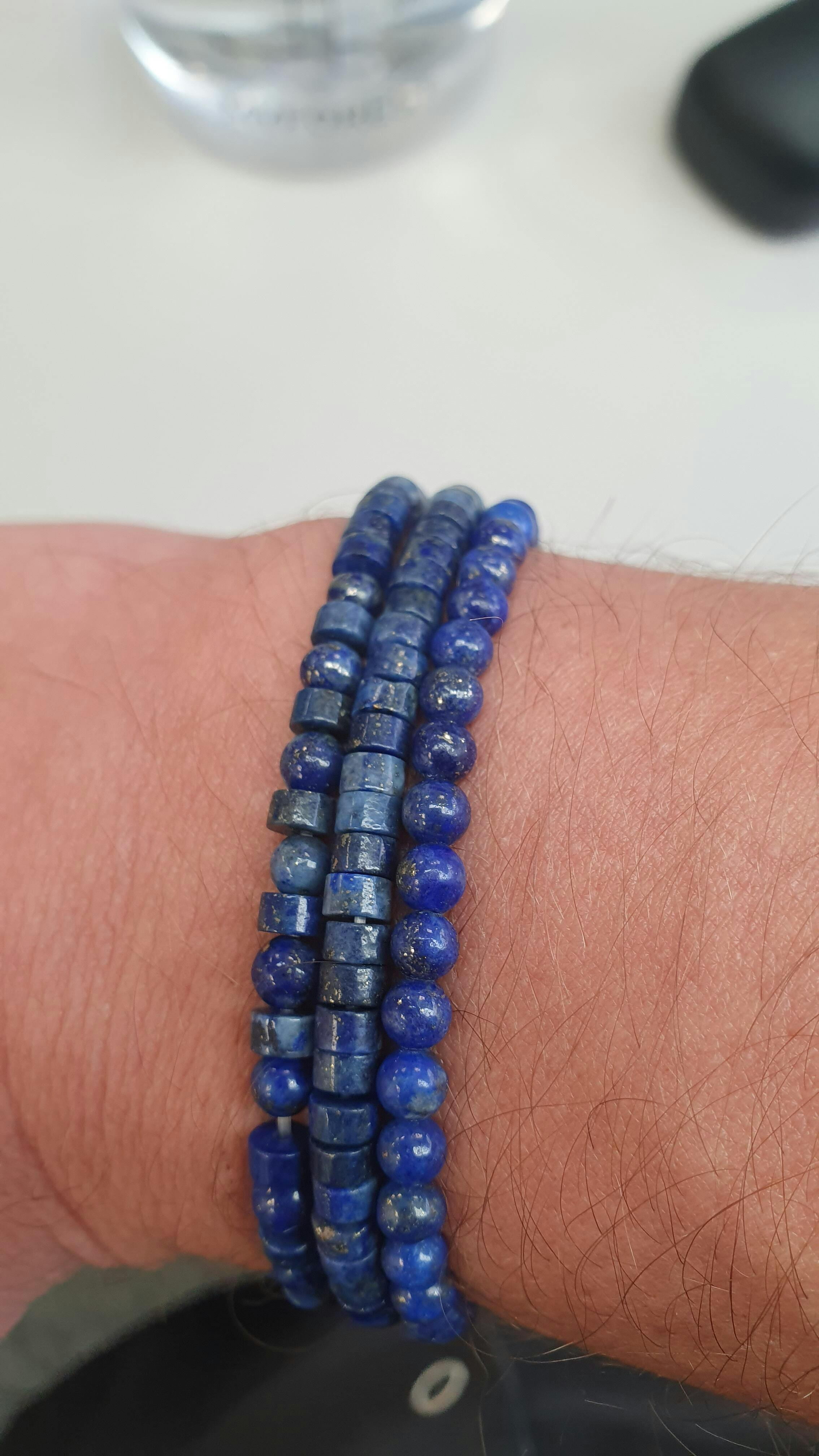 perles Heishi régulières et polies. Leur bleu royal, parfois veiné de blanc (calcite) ou de doré (pyrite), évoque les ciels étoilés antiques auxquels cette gemme a longtemps été associée. Ces perles offrent un rendu à la fois mystique et raffiné.