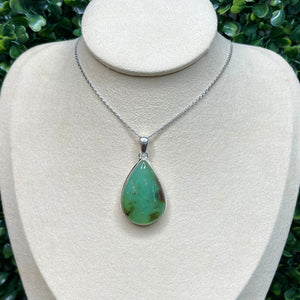 Pendentif Argent 925 Chrysoprase Boulder, un bijou unique monté sur de l'argent 925, accompagné d'une chaîne en acier inoxydable de 45 cm. Chaque pendentif présente des motifs distincts, des formations organiques, rendant chaque pièce véritablement unique. Le Chrysoprase Boulder est reconnue pour ses propriétés apaisantes.