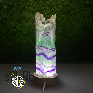lampe en Fluorite naturelle se distingue par ses superbes bandes de couleurs allant du vert au violet, révélant toute la richesse minérale de cette pierre emblématique. Taillée en forme de colonne et montée sur une