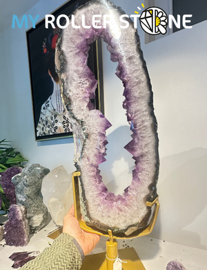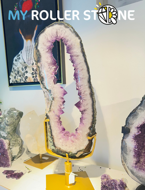 Découvrez l’améthyste pivotante, présentée sous la forme d’une tranche finement taillée et installée sur un support rotatif. Cette pièce unique laisse apparaître des nuances de violet cristallin, rehaussées par la lumière qui traverse ou effleure la pierre lorsqu’elle tourne sur elle-même. Véritable objet de décoration, elle allie esthétisme et propriétés énergétiques, pour un rendu visuel à la fois fascinant et élégant.