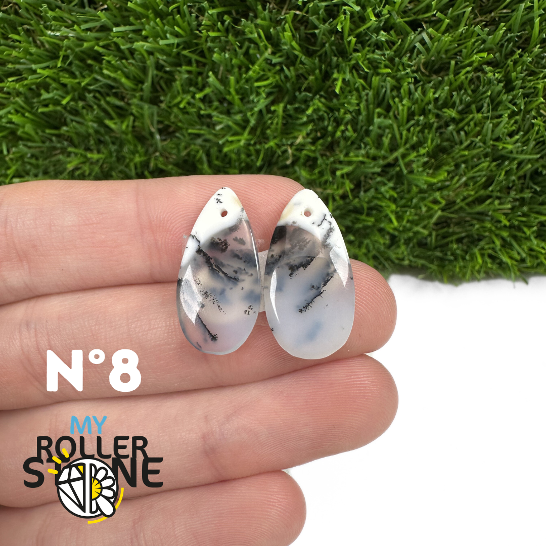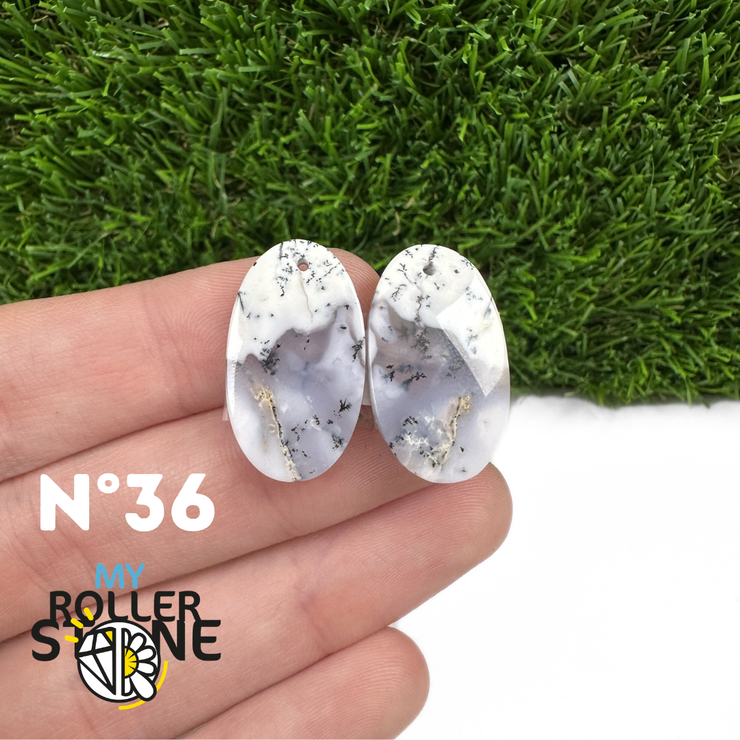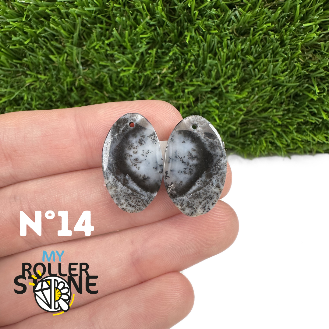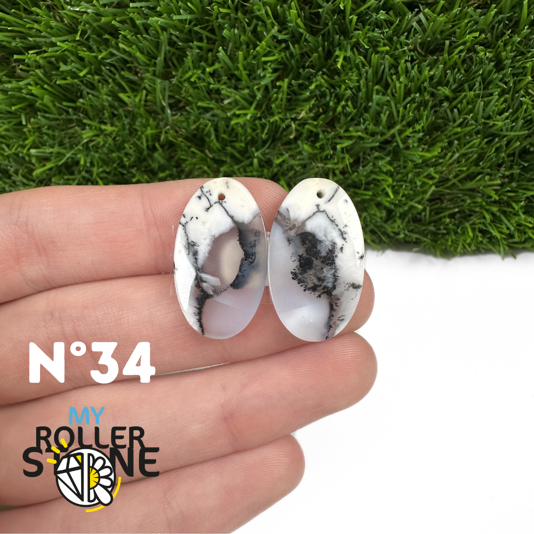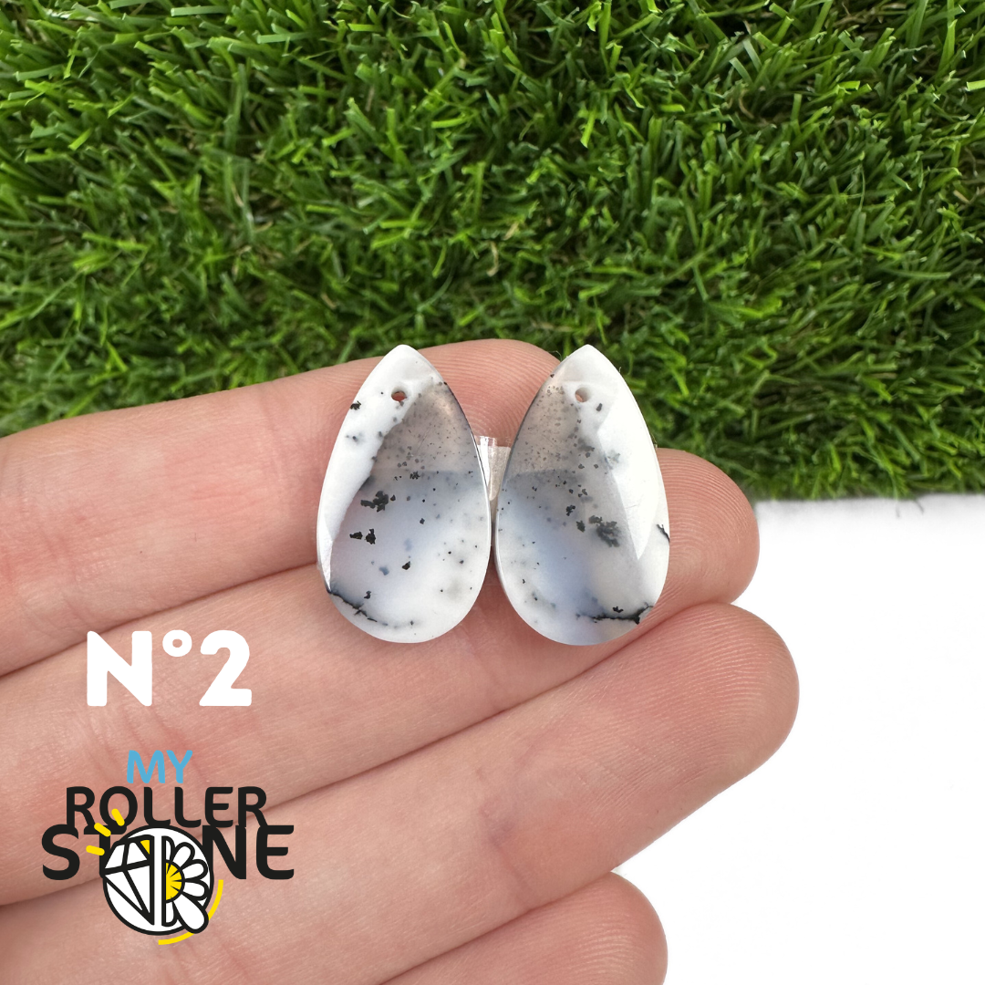 Cette paire de cabochons percés en Opale Dendritique naturelle révèle des motifs arborescents uniques, formés naturellement au cœur de la pierre. Chaque paire présente un contraste élégant entre un fond clair et des inclusions dendritiques sombres, offrant un rendu visuel harmonieux et distinctif, particulièrement recherché pour la création de boucles d’oreilles.