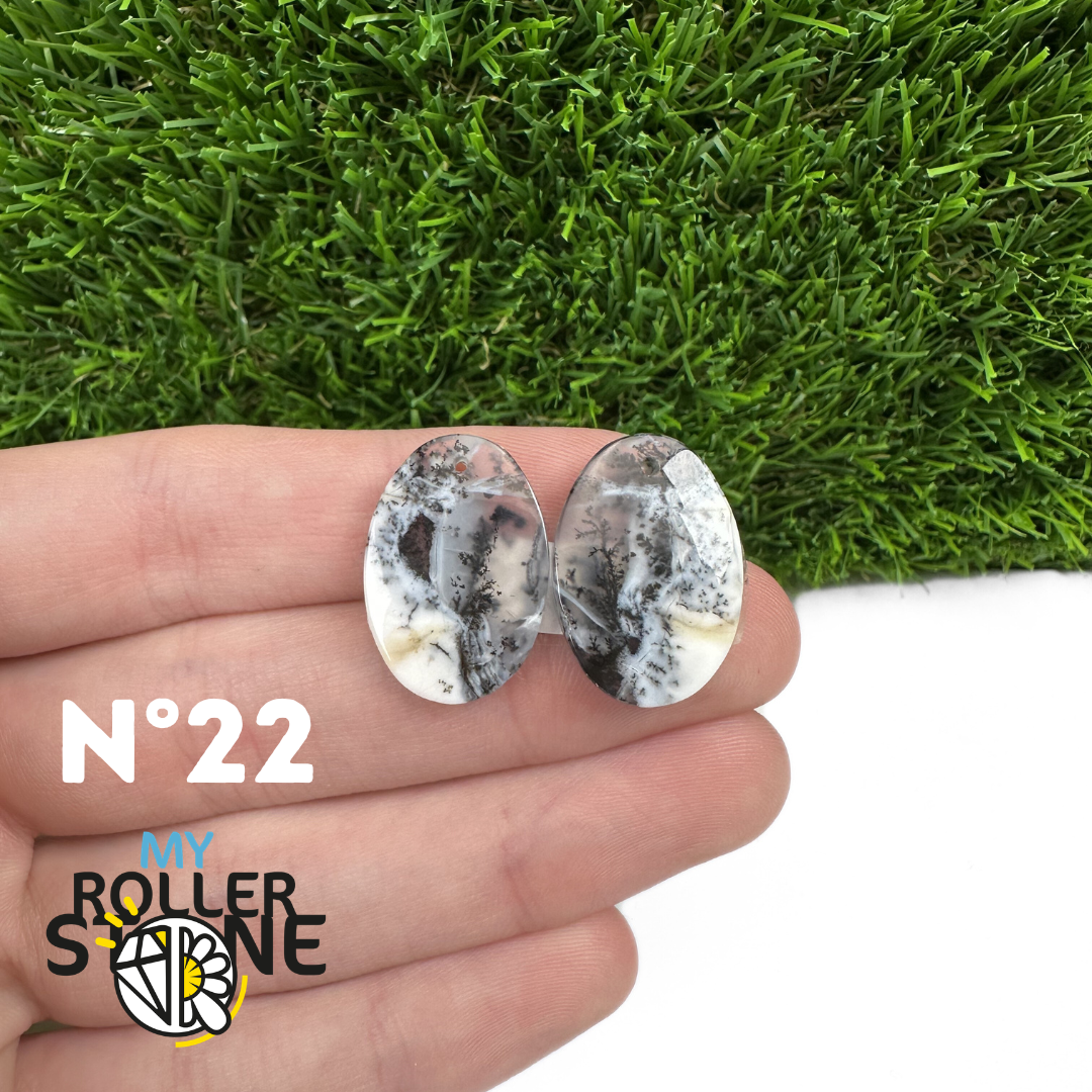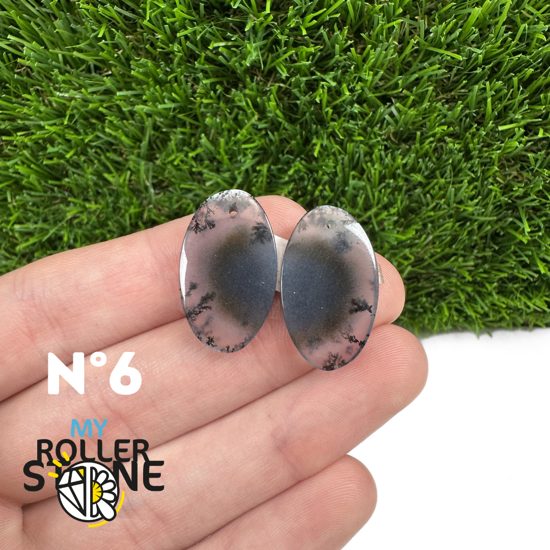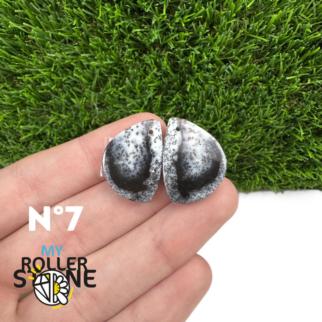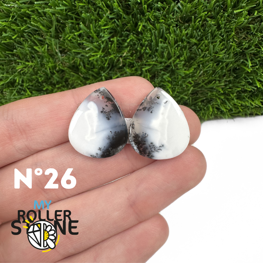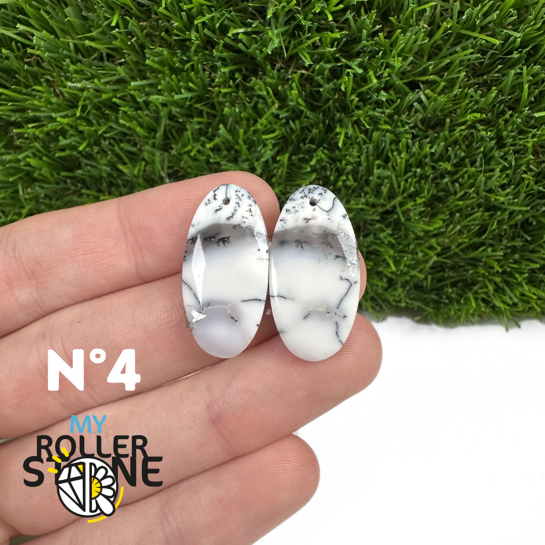 Cette paire de cabochons percés en Opale Dendritique naturelle révèle des motifs arborescents uniques, formés naturellement au cœur de la pierre. Chaque paire présente un contraste élégant entre un fond clair et des inclusions dendritiques sombres, offrant un rendu visuel harmonieux et distinctif, particulièrement recherché pour la création de boucles d’oreilles.
