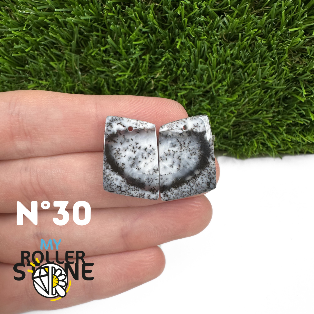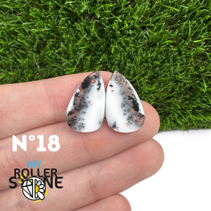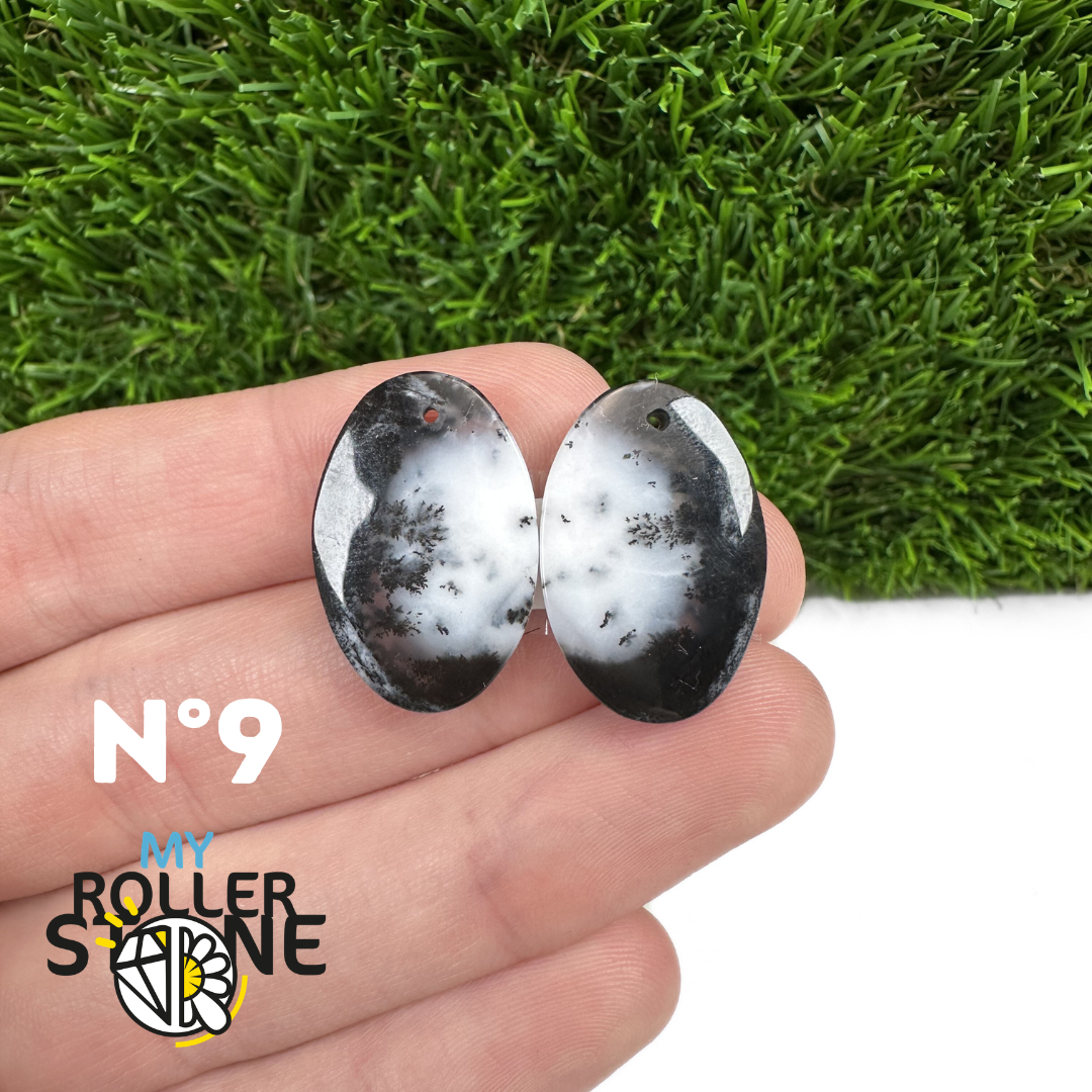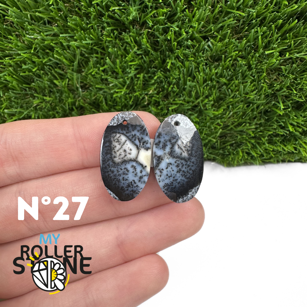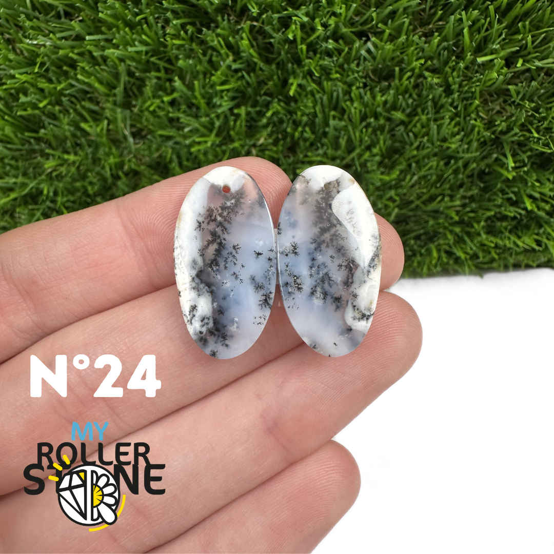 Cette paire de cabochons percés en Opale Dendritique naturelle révèle des motifs arborescents uniques, formés naturellement au cœur de la pierre. Chaque paire présente un contraste élégant entre un fond clair et des inclusions dendritiques sombres, offrant un rendu visuel harmonieux et distinctif, particulièrement recherché pour la création de boucles d’oreilles.