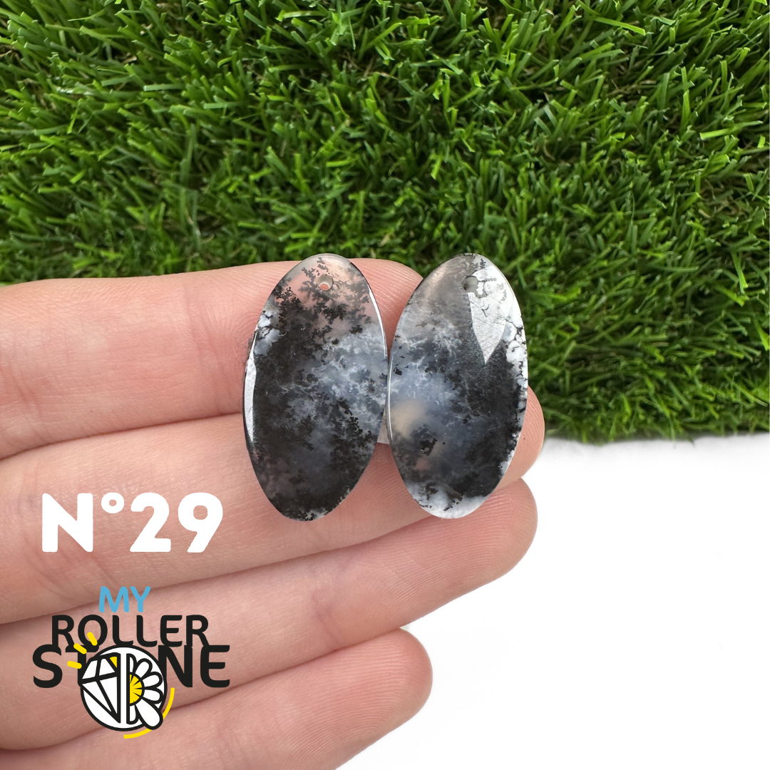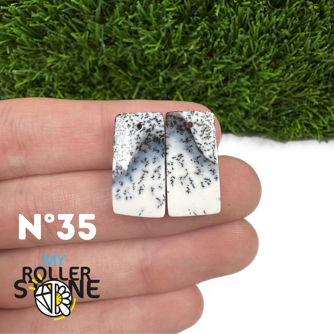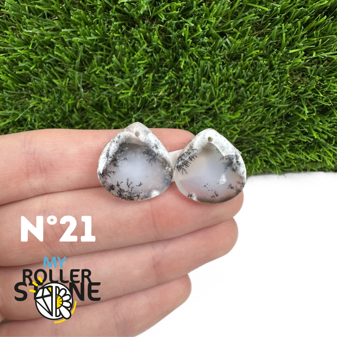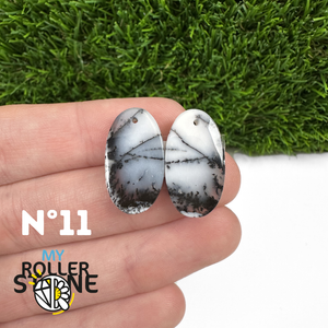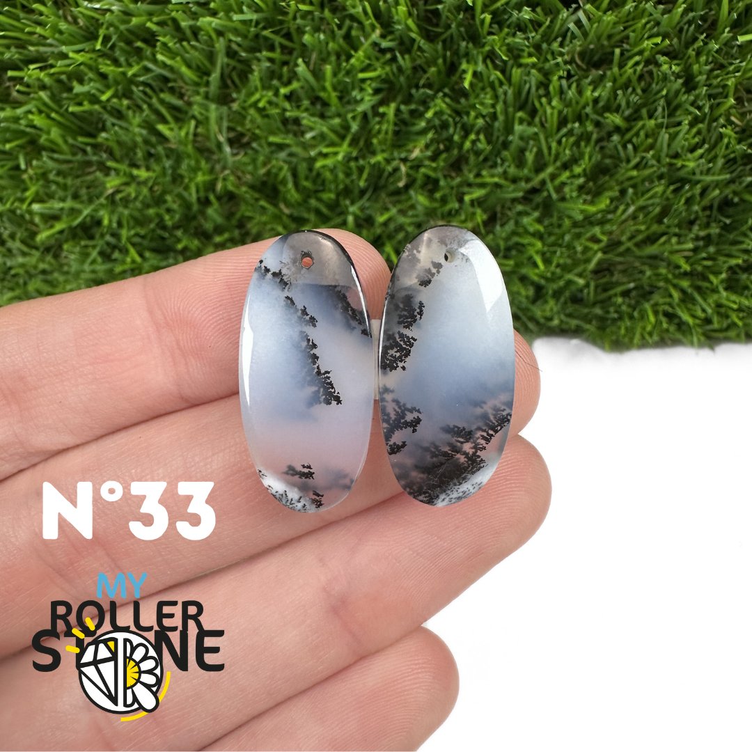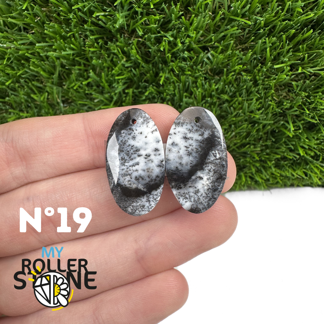 Cette paire de cabochons percés en Opale Dendritique naturelle révèle des motifs arborescents uniques, formés naturellement au cœur de la pierre. Chaque paire présente un contraste élégant entre un fond clair et des inclusions dendritiques sombres, offrant un rendu visuel harmonieux et distinctif, particulièrement recherché pour la création de boucles d’oreilles.